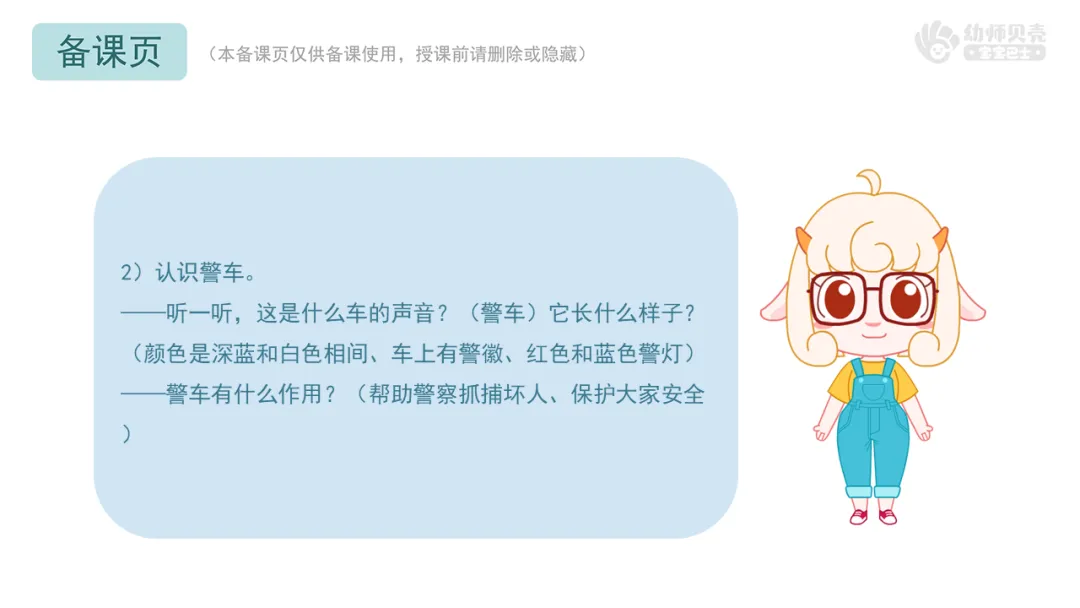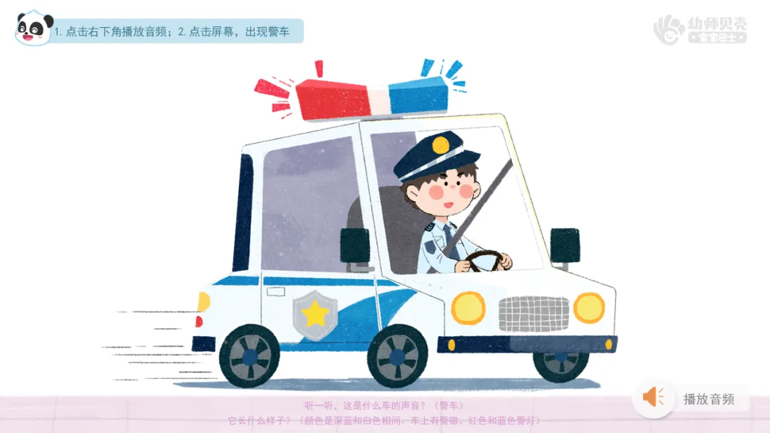 ——听一听,这是什么车的声音?(警车)它长什么样子?(颜色是深蓝和白色相间、车上有警徽、红色和蓝色警灯)