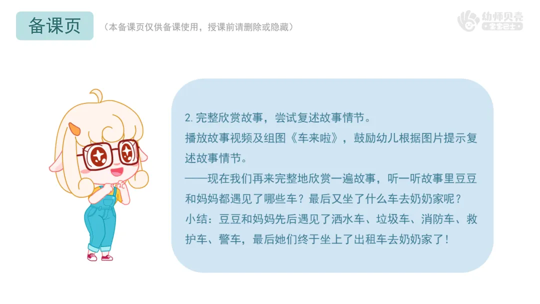 ——现在我们再来完整地欣赏一遍故事,听一听故事里豆豆和妈妈都遇见了哪些车?最后又坐了什么车去奶奶家呢?
