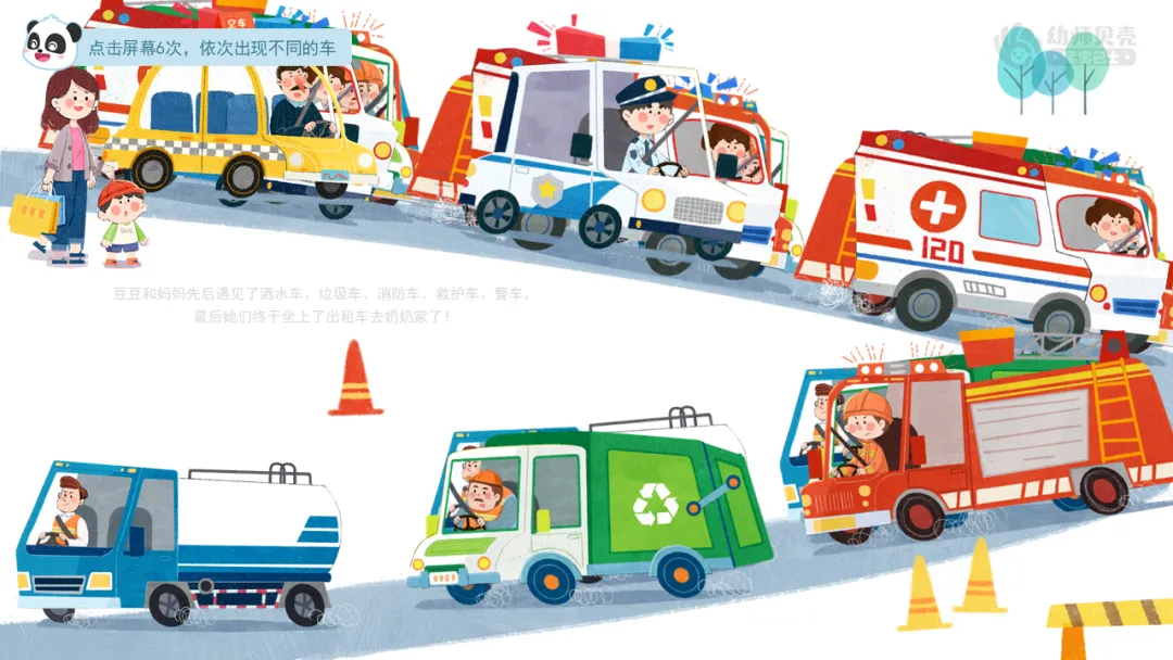 小结:豆豆和妈妈先后遇见了洒水车、垃圾车、消防车、救护车、警车,最后她们终于坐上了出租车去奶奶家了!