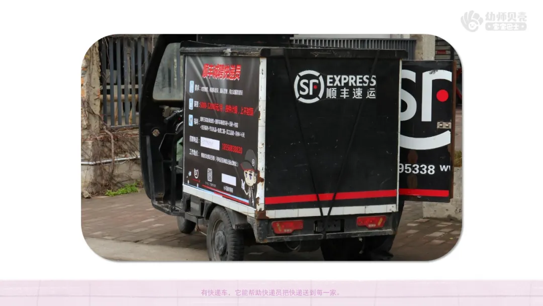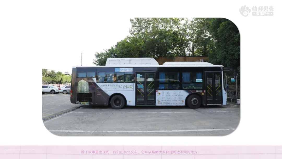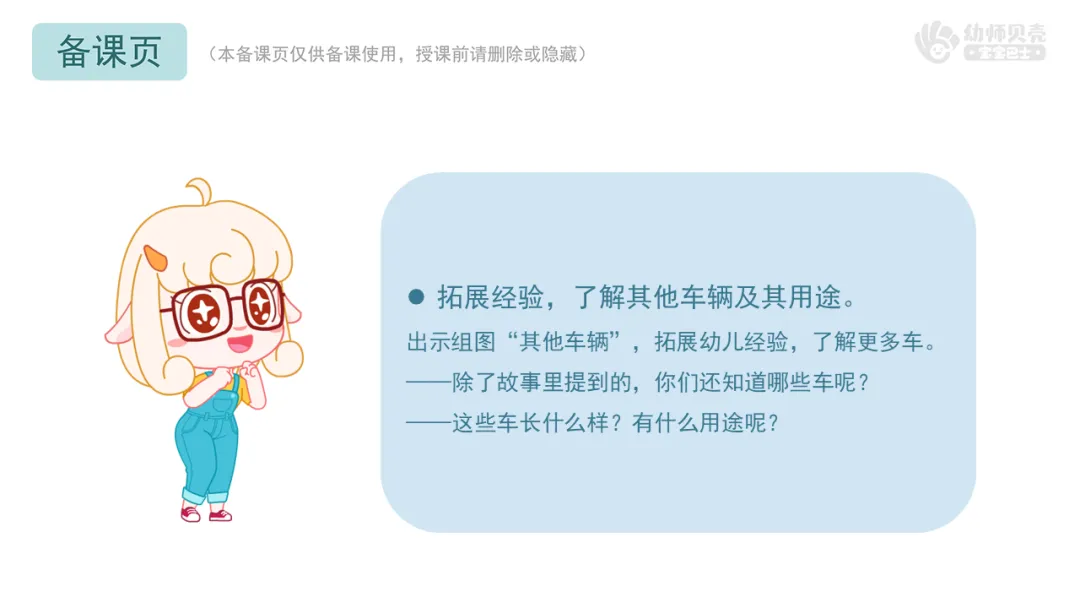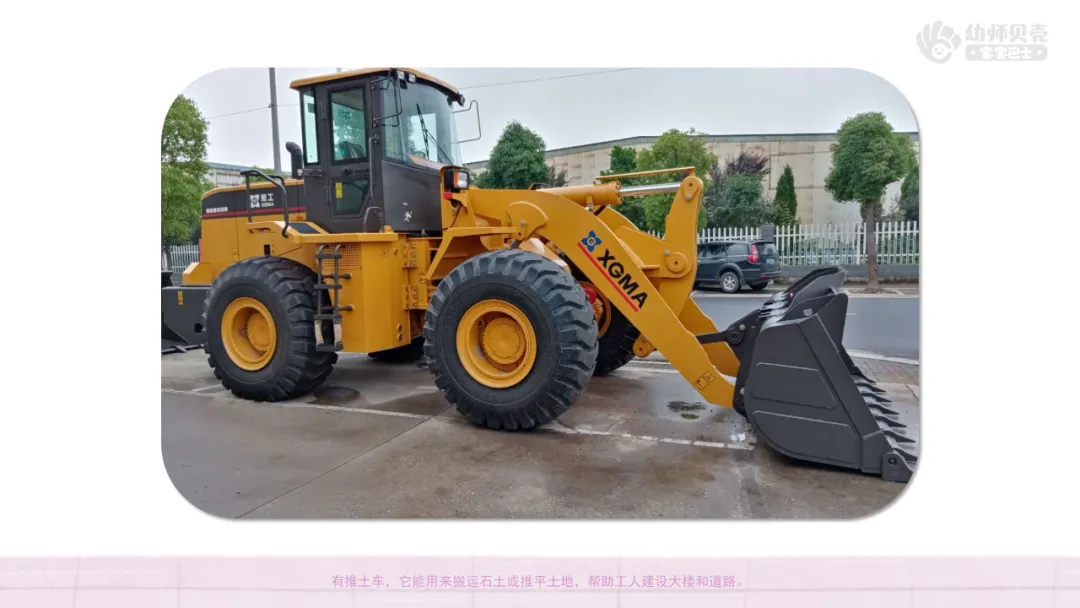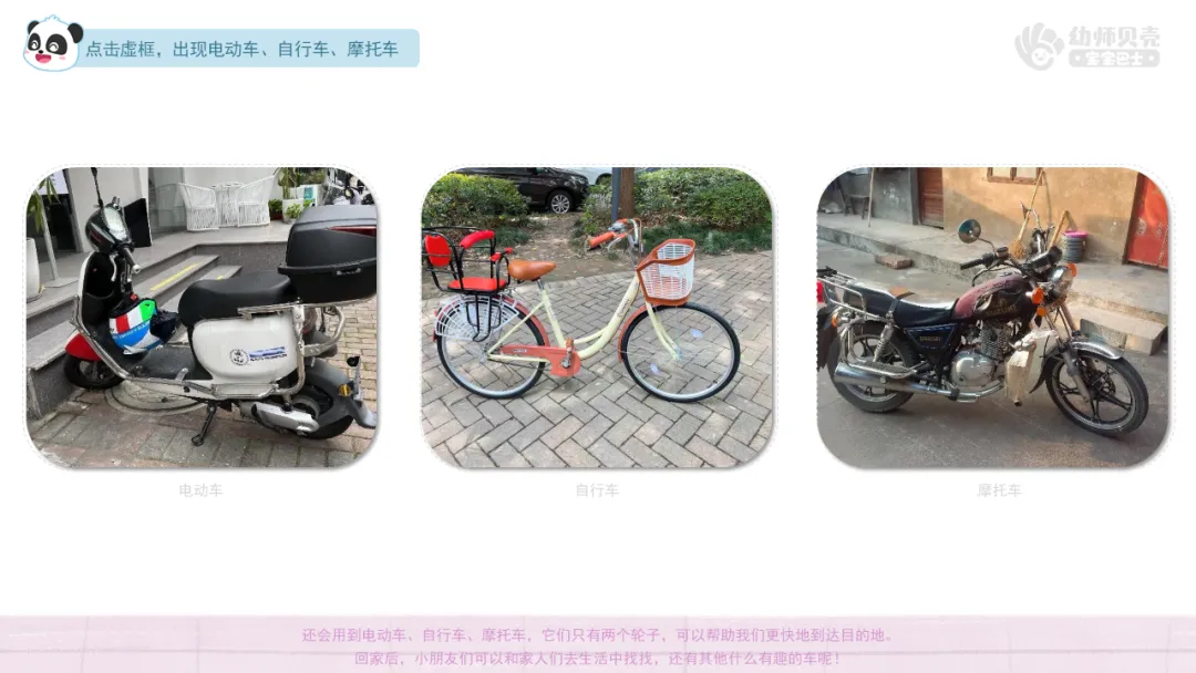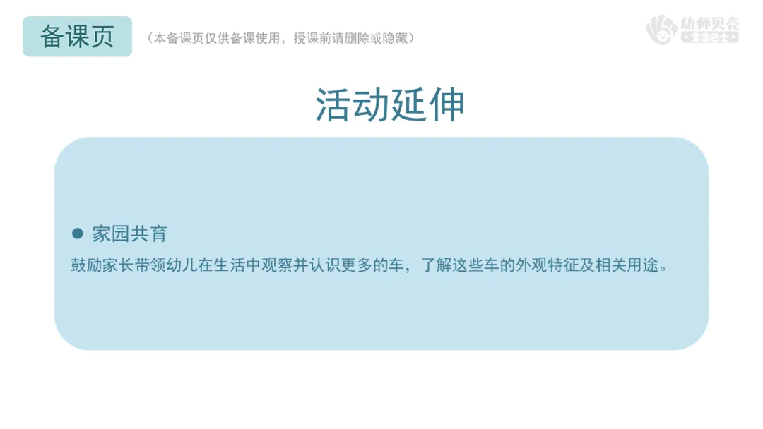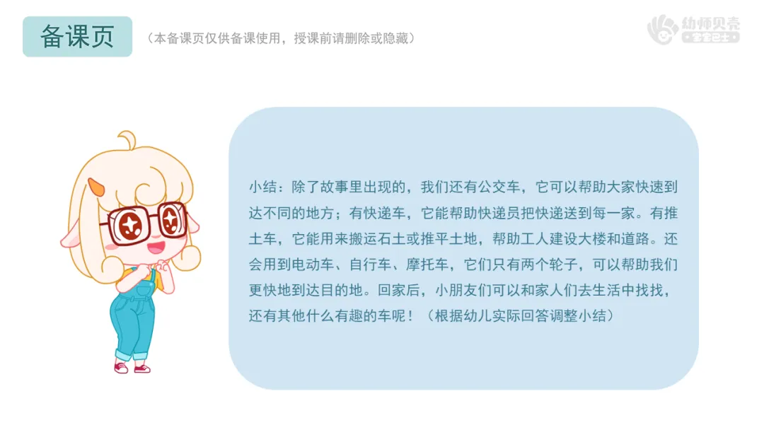 小结:除了故事里出现的,我们还有公交车,它可以帮助大家快速到达不同的地方;有快递车,它能帮助快递员把快递送到每一家。有推土车,它能用来搬运石土或推平土地,帮助工人建设大楼和道路。还会用到电动车、自行车、摩托车,它们只有两个轮子,可以帮助我们更快地到达目的地。回家后,小朋友们可以和家人们去生活中找找,还有其他什么有趣的车呢!(根据幼儿实际回答调整小结)