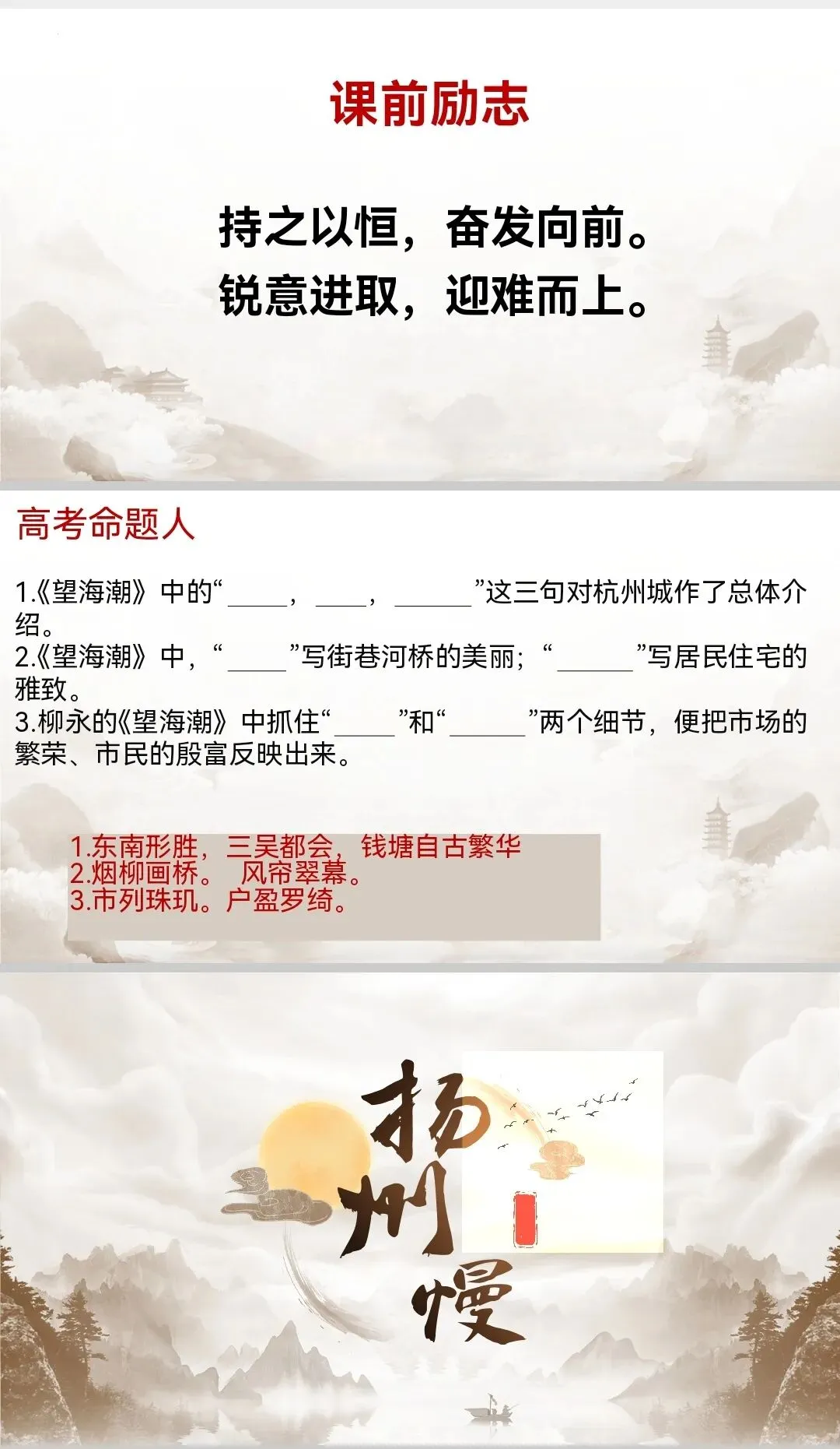 1.《望海潮》中的“ , , ”这三句对杭州城作了总体介绍。