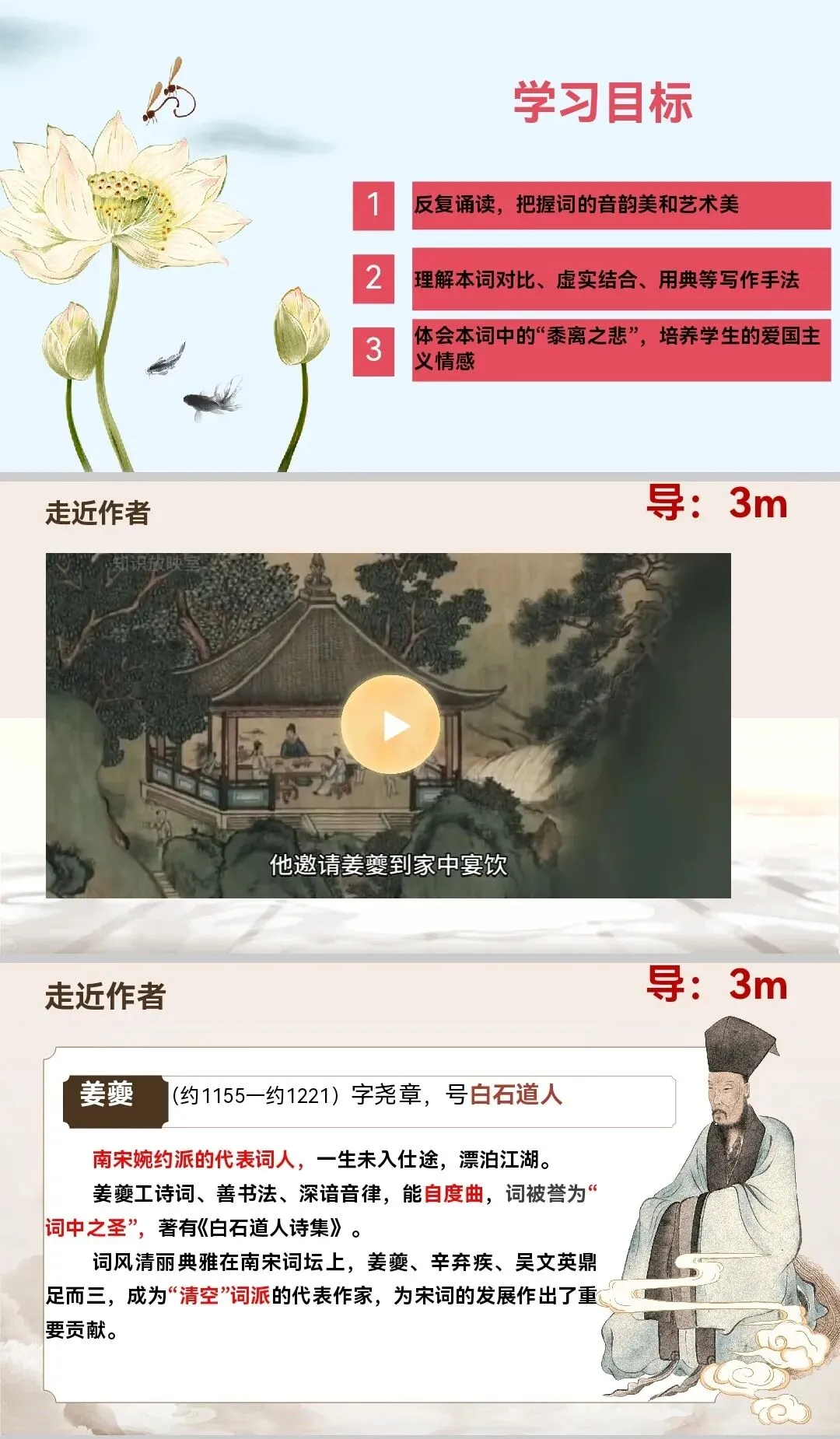 二、导入新课:以介绍姜夔是视频导入三、作者简介: