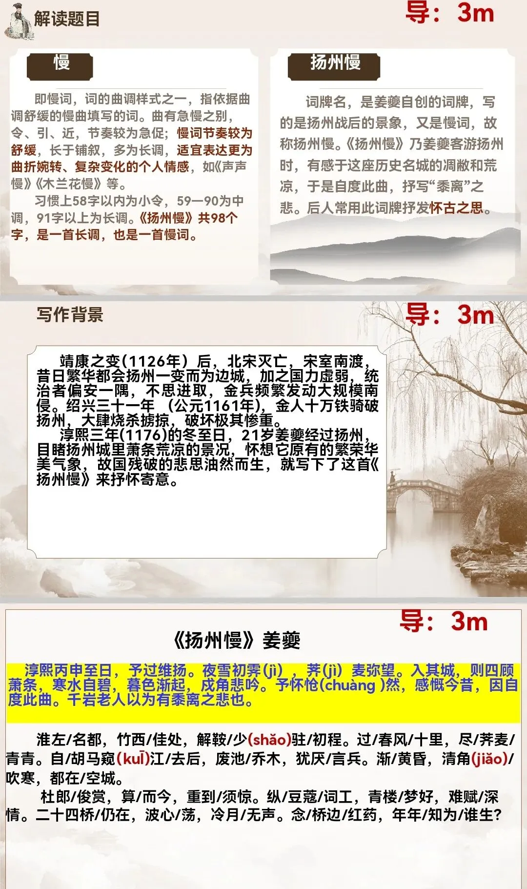 扬州慢:词牌名,是姜夔自创的词牌,写的是扬州战后的景象,又是慢词,故称扬州慢。《扬州慢》乃姜夔客游扬州时,有感于这座历史名城的凋敝和荒凉,于是自度此曲,抒写“黍离”之悲。后人常用此词牌抒发怀古之思。