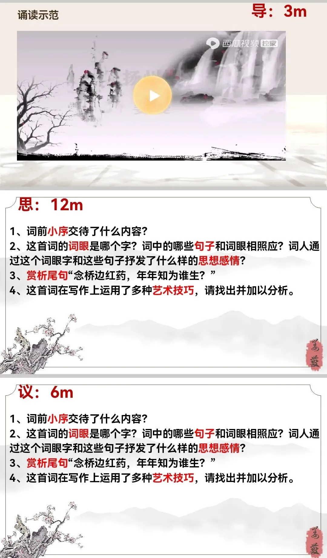 要求学生结合课下注解及课后学习提示,自主阅读诗歌。并思考下列问题:1、词前小序交待了什么内容?