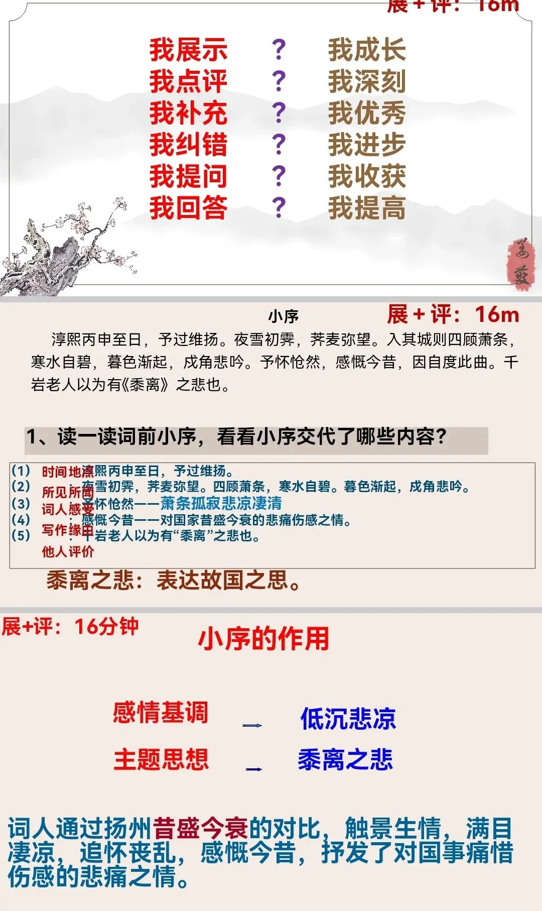 4、体会本词中的“黍离之悲”,培养学生的爱国主义情感。