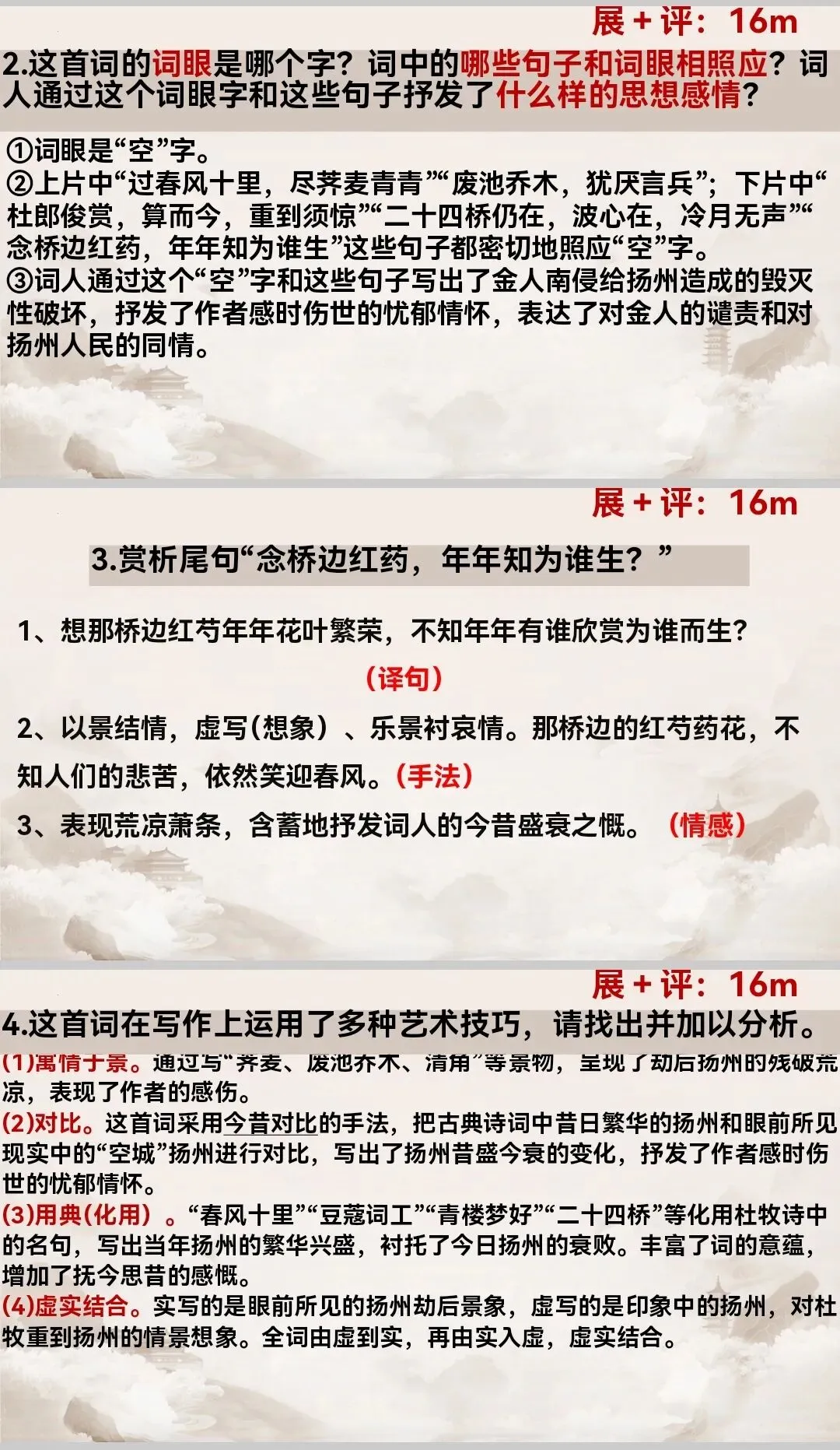 (3)用典(化用)。“春风十里”“豆蔻词工”“青楼梦好”“二十四桥”等化用杜牧诗中的名句,写出当年扬州的繁华兴盛,衬托了今日扬州的衰败。丰富了词的意蕴,增加了抚今思昔的感慨。