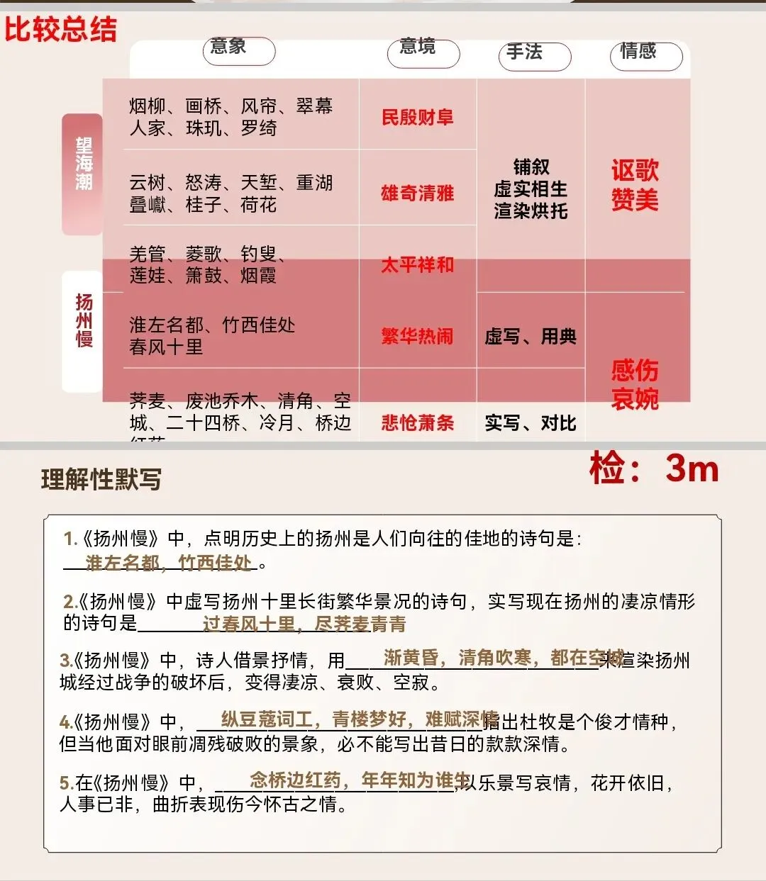 (4)虚实结合。实写的是眼前所见的扬州劫后景象,虚写的是印象中的扬州,对杜牧重到扬州的情景想象。全词由虚到实,再由实入虚,虚实结合。