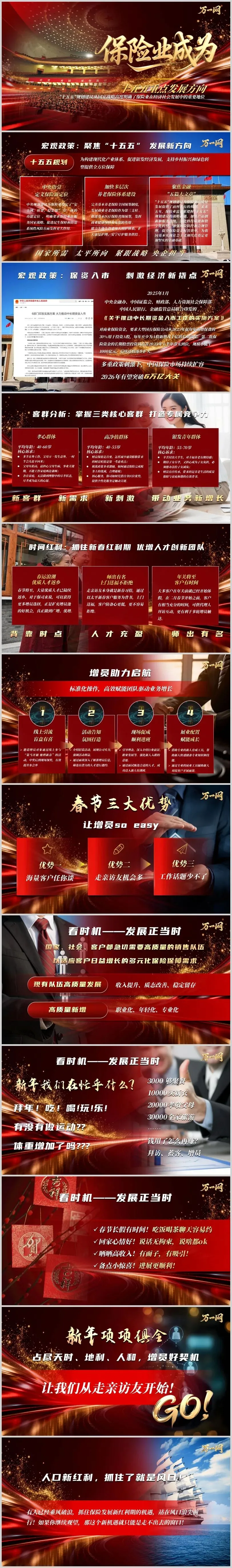 话题丰富易于切入:春节聚会中,年终收入、新年规划、健康养老、家庭责任等都是自然而然的话题,可以平滑地引导至职业发展、财富规划和保险保障上来,实现“润物细无声”的增员与理念沟通。