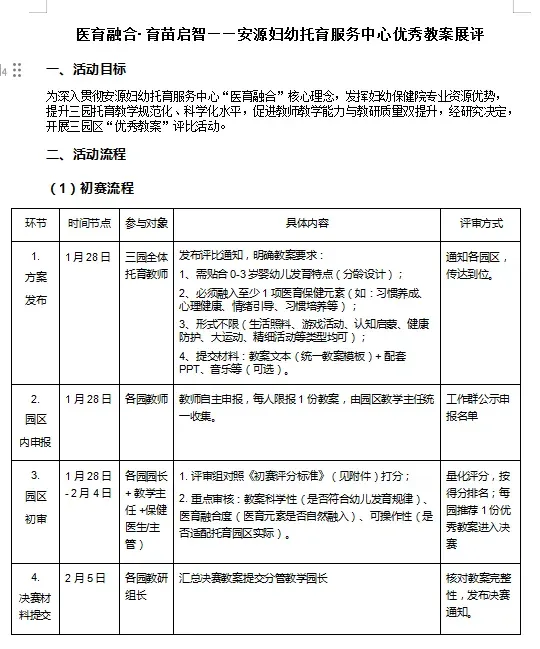 为深入贯彻安源妇幼托育服务中心“医育融合”核心理念,发挥妇幼保健院专业资源优势,提升托育教学规范化、科学化水平,促进教师教学能力与教研质量双提升,2026年2月7日上午,安源妇幼托育服务中心三个园区开展了教案展评活动。