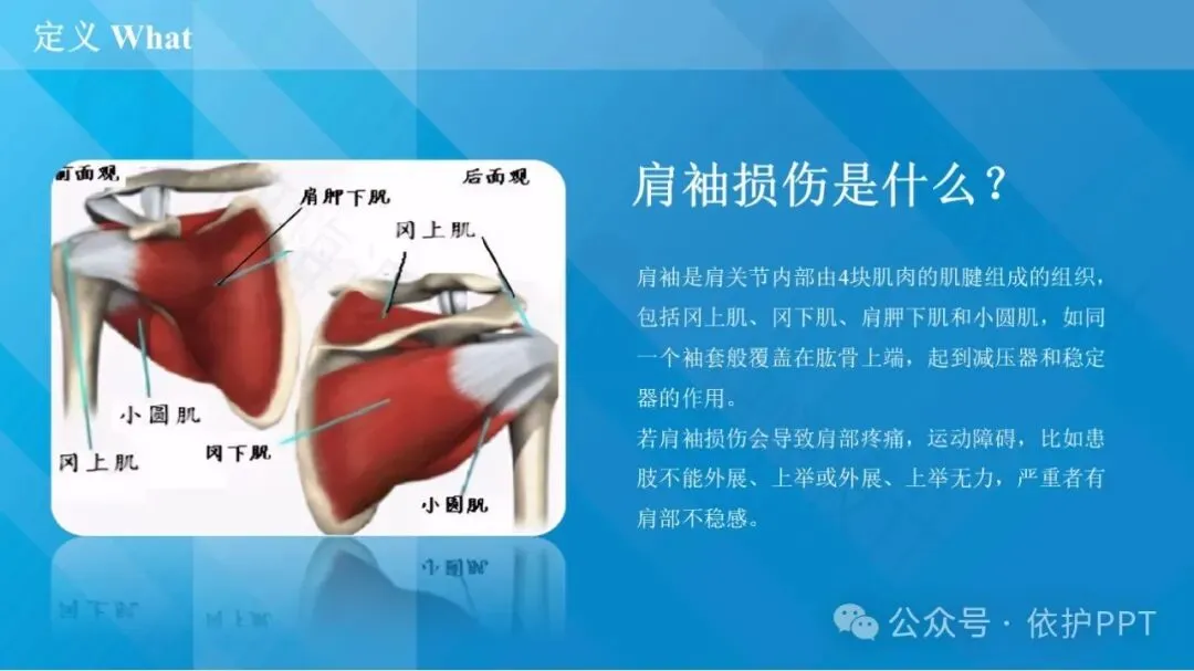 肩袖是肩关节内部由4块肌肉的肌腱组成的组织,包括冈上肌、冈下肌、肩胛下肌和小圆肌,如同一个袖套般覆盖在肱骨上端,起到减压器和稳定器的作用。