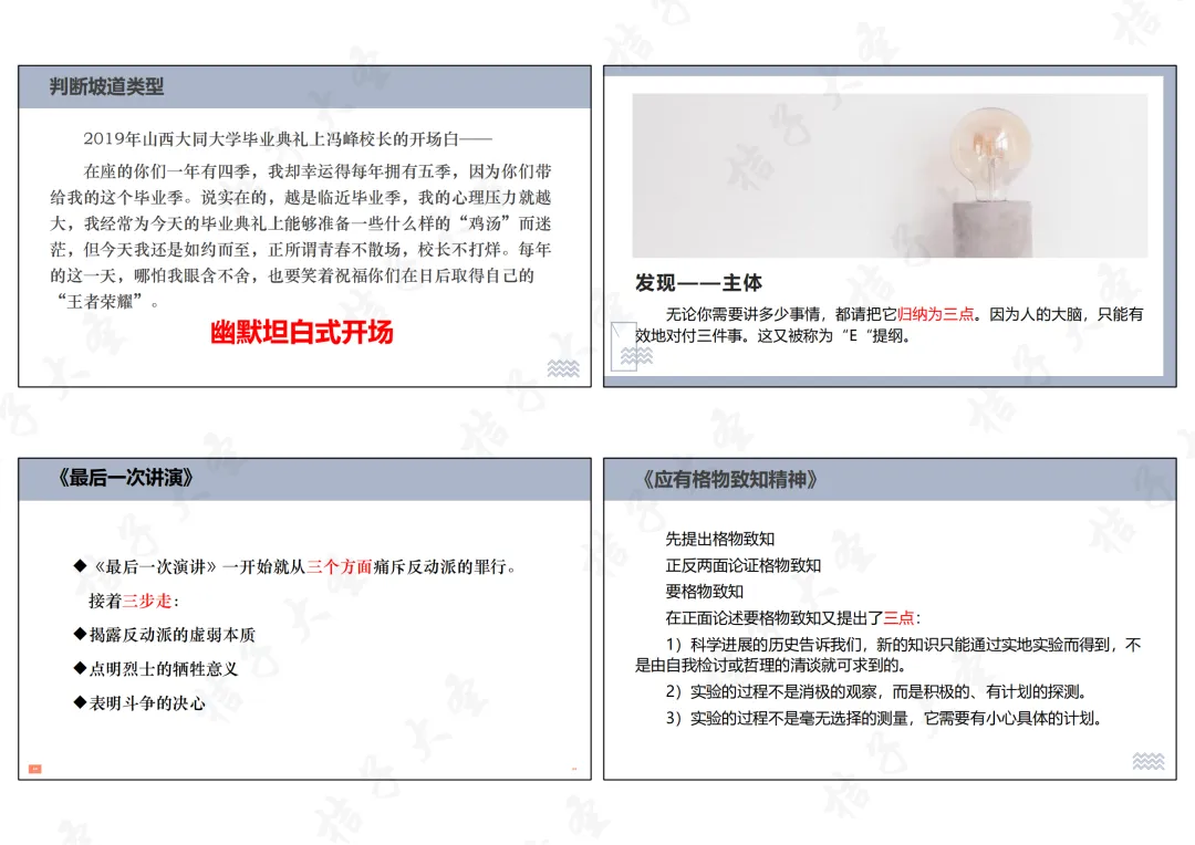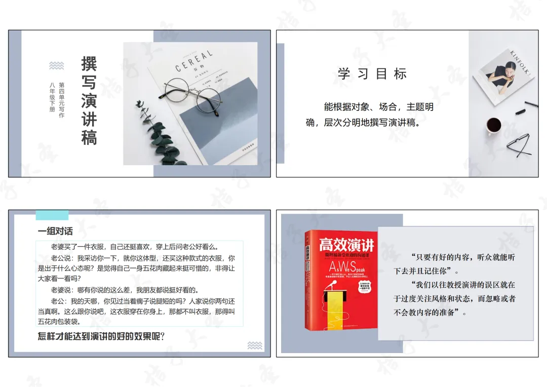 3.思维能力:通过分析、拆解经典演讲稿,培养逻辑思维、归纳概括能力,学会用三点式提纲搭建清晰的表达思路。