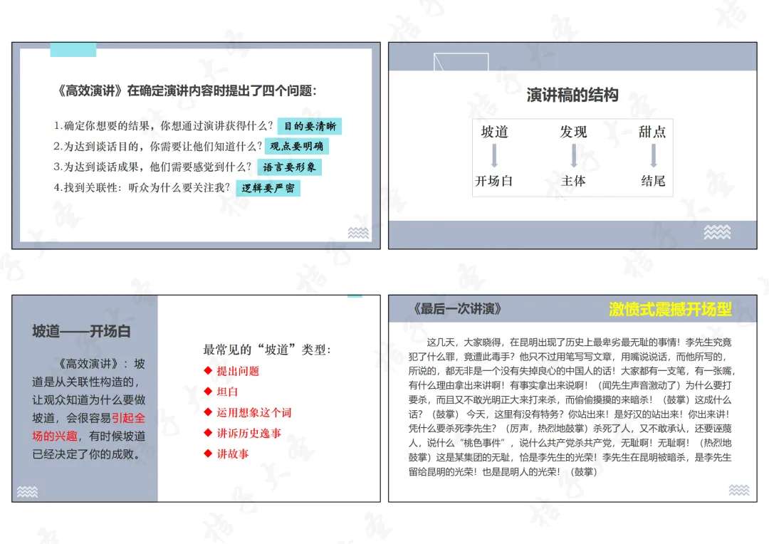 1.引入专业书籍:《高效演讲》中强调“好内容是演讲的核心”。