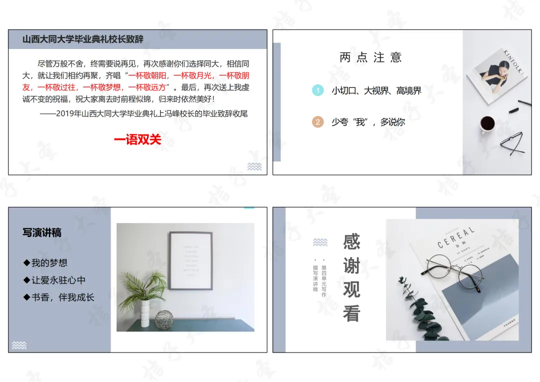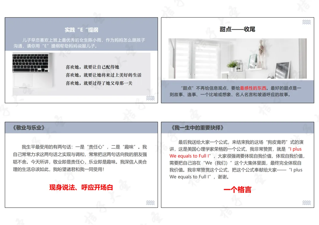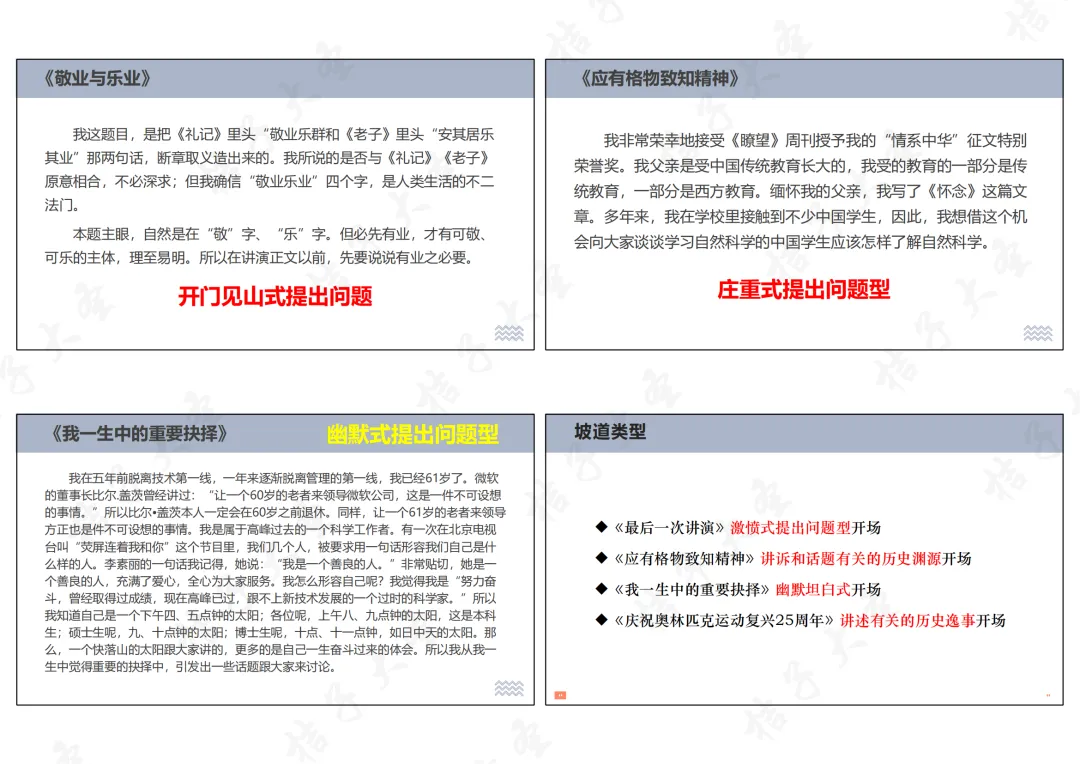 (1)小切口、大视界、高境界:从具体的小事、小角度切入,延伸到更广阔的视野,最终升华到高尚的境界,让演讲有深度、有温度;