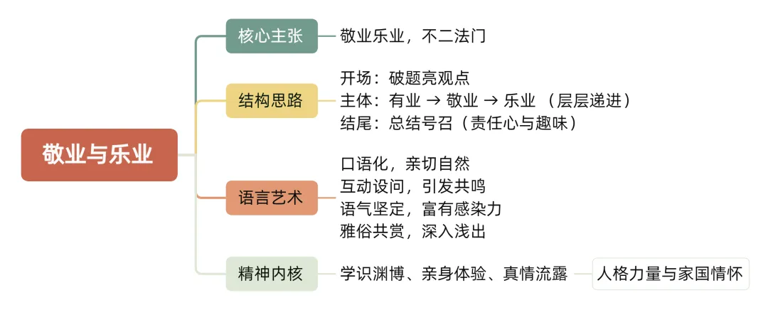讨论后明确:递进深入,符合思维规律。“有业→敬业→乐业”是一个从“基础”到“态度”再到“境界”的递进过程。听众的思维被自然而然地引导着,从“必须有事情做”,到“应该认真做事”,最后抵达“享受做事乐趣”的理想状态。这个过程如登山,一步步引领听众到达思想的高处。