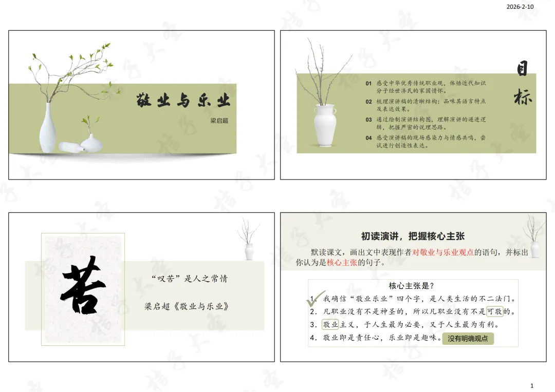 1.文化自信:感受梁启超“敬业乐业”主张中蕴含的中华优秀传统职业观,体悟近代知识分子经世济民的家国情怀。