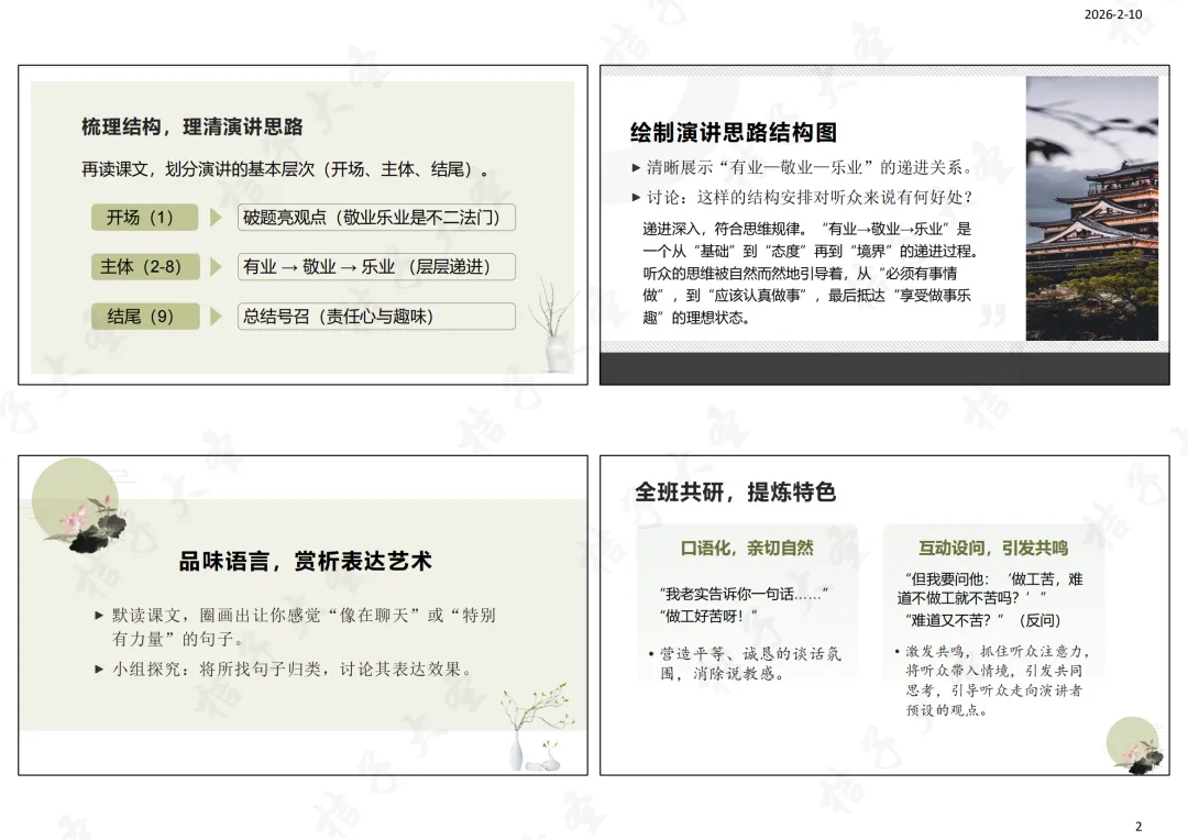 2.语言运用:梳理演讲稿“开场—主体—结尾”的清晰结构;品味其口语化、互动性强的语言特点及设问、反问的表达效果。