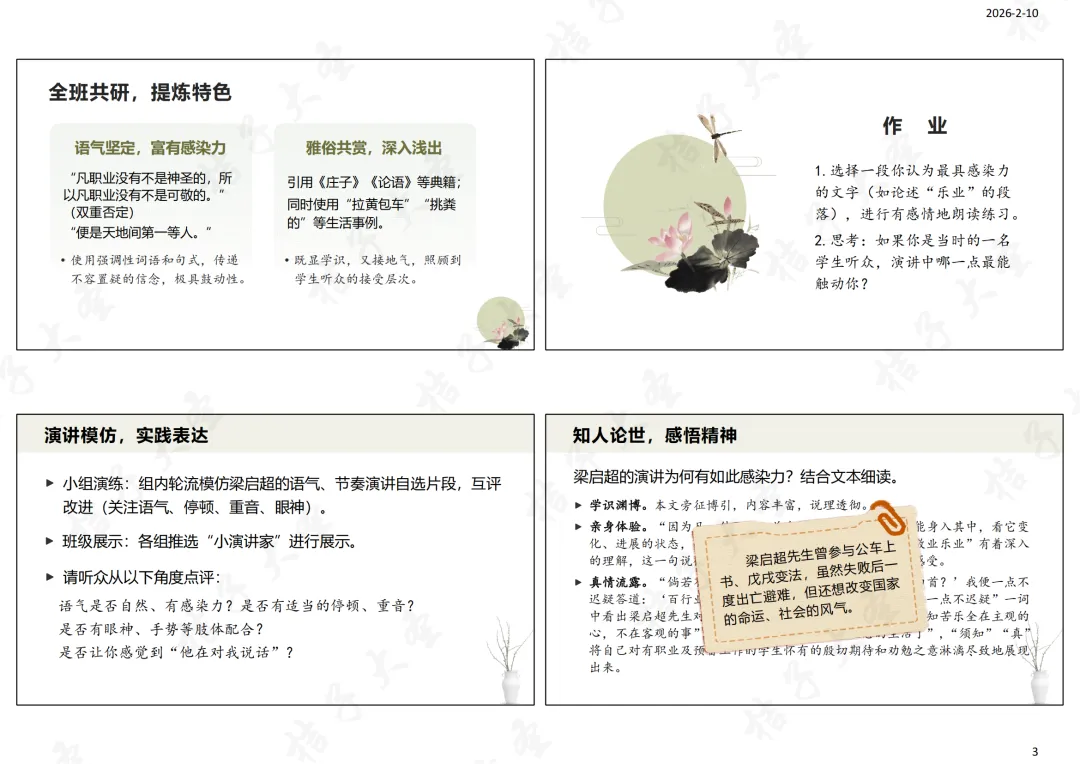 1.小组演练:组内轮流模仿梁启超的语气、节奏演讲自选片段,互评改进(关注语气、停顿、重音、眼神)。