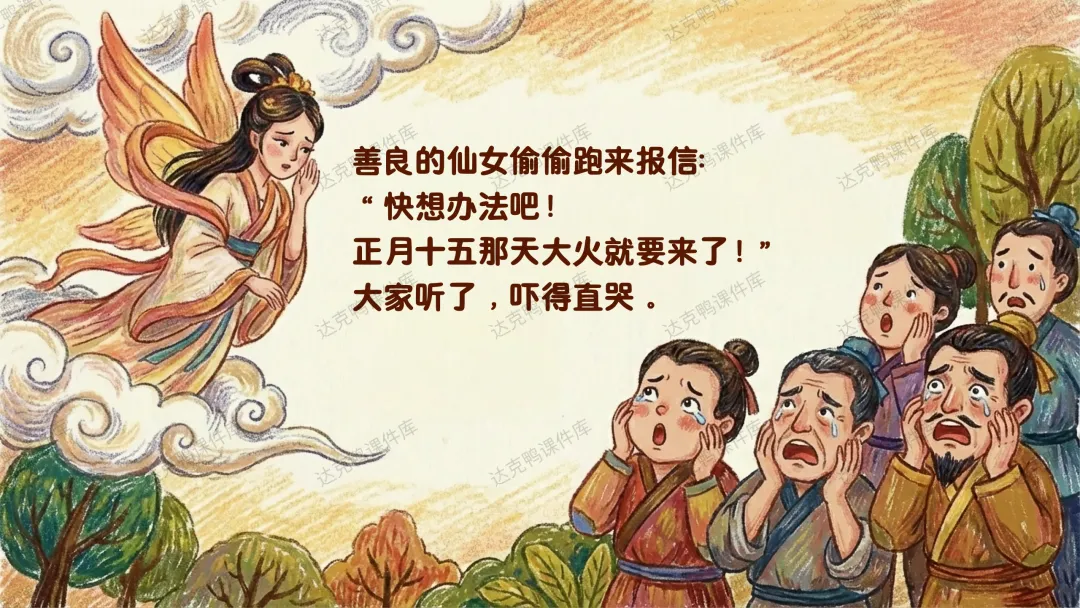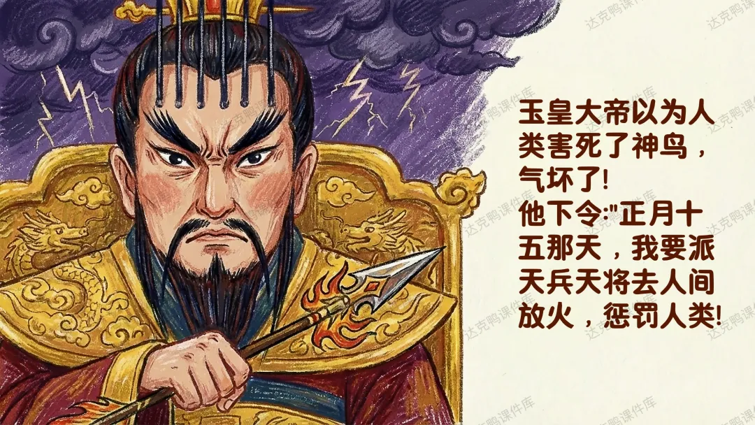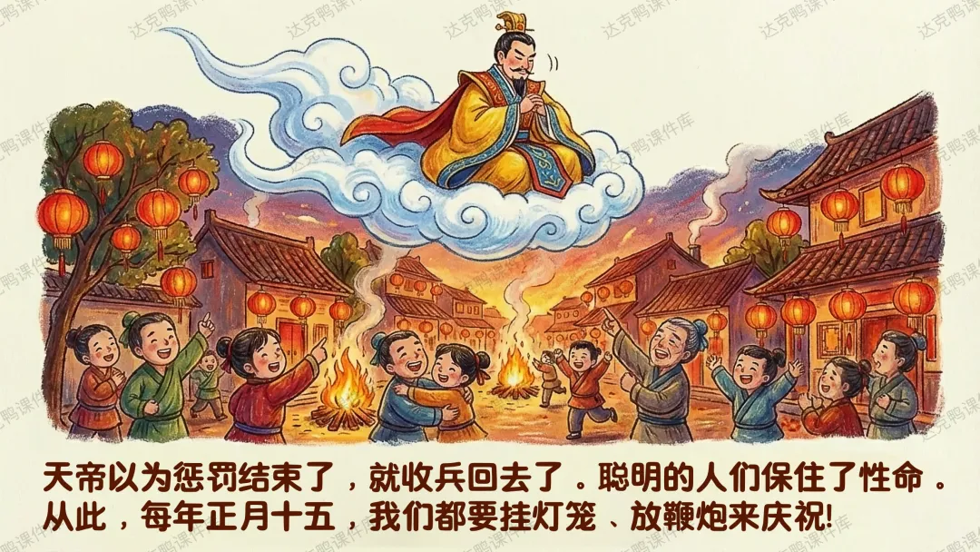 1. 认知目标:知道元宵节的时间是农历正月十五,理解“挂灯笼、放鞭炮”习俗由来的神话传说(神鸟的故事)。