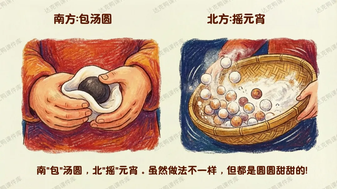2. 知识目标:了解“南包汤圆,北摇元宵”的制作差异,以及“走百病”等特定习俗的寓意。