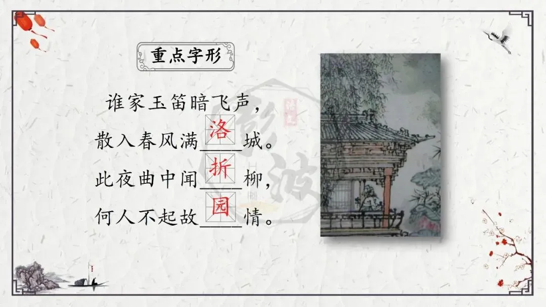 (2)表颜色的词:颜色一般表现心情,增强描写的色彩感和画面感,渲染气氛。欣赏时,或抓住能表现色彩组合的字眼,体会诗歌的浓郁的画意与鲜明的节奏:“两个黄鹂鸣翠柳,一行白鹭上青天”,黄、翠、白、青四种颜色,点缀得错落有致,而且由点到线,向着无限的空间延伸,画面静中有动,富有鲜明的立体节奏感。