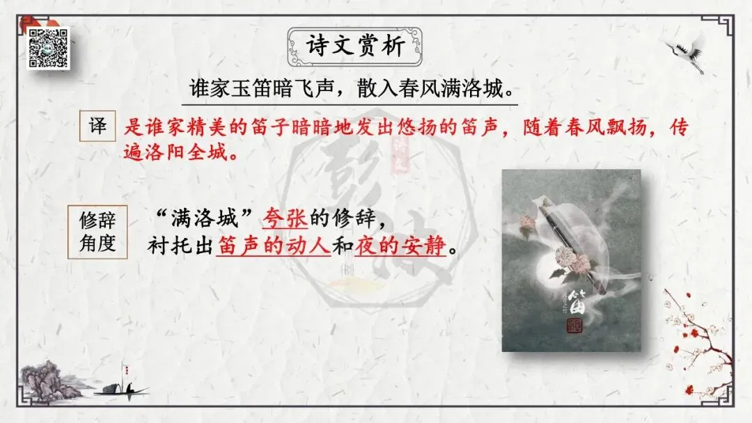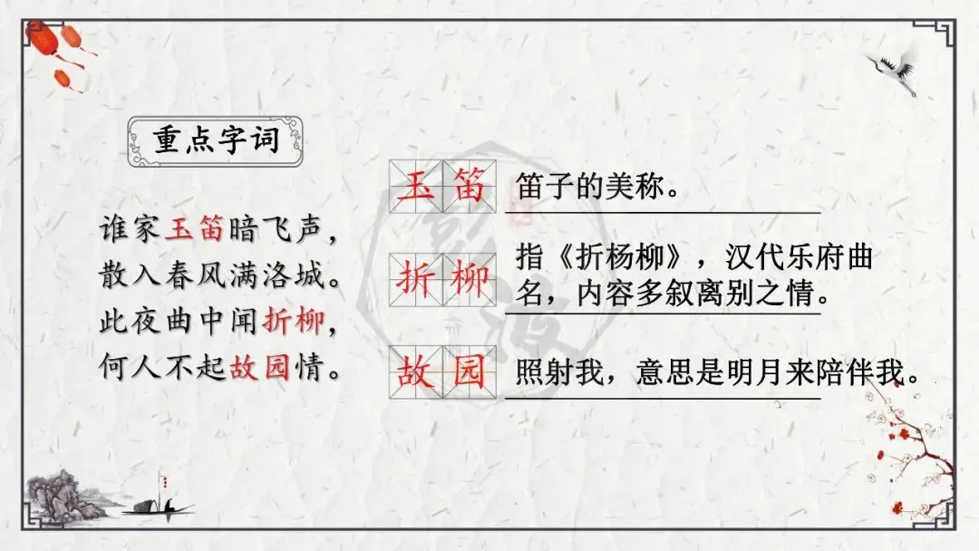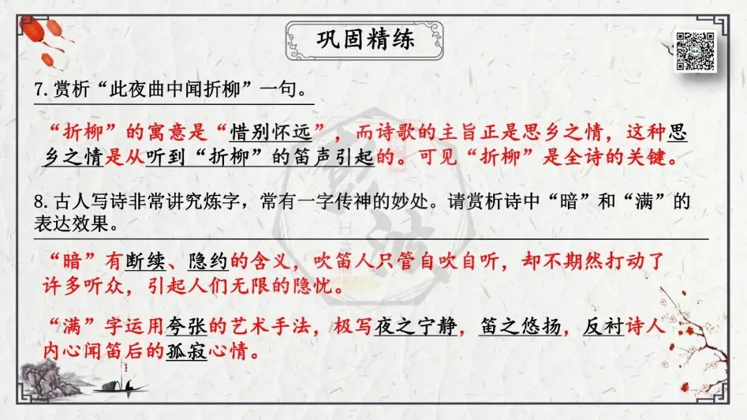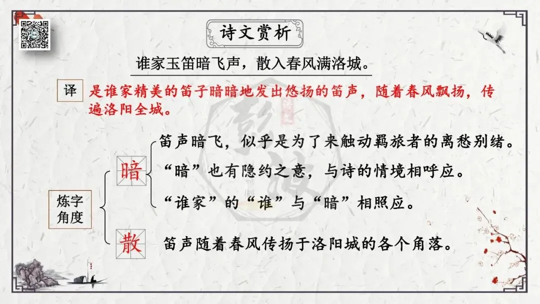 2、修饰语:大部分为形容词,它在诗词鉴赏中也是关注的重点对象。例:黄河远上白云间,一片孤城万仞山。 一个“孤”字,写尽环境之孤苦,由此可达人心。