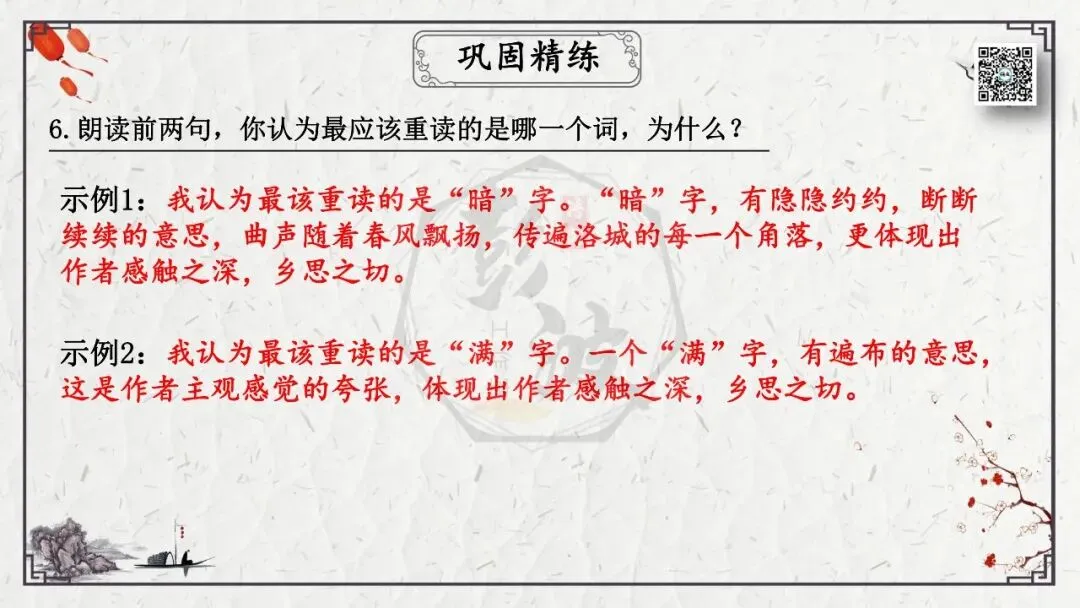 3、感知形象。要求考生通过形象思维,借助联想和想象,感知诗词中的景物、形象,体会作品的意境、情境,领悟作者的情感。