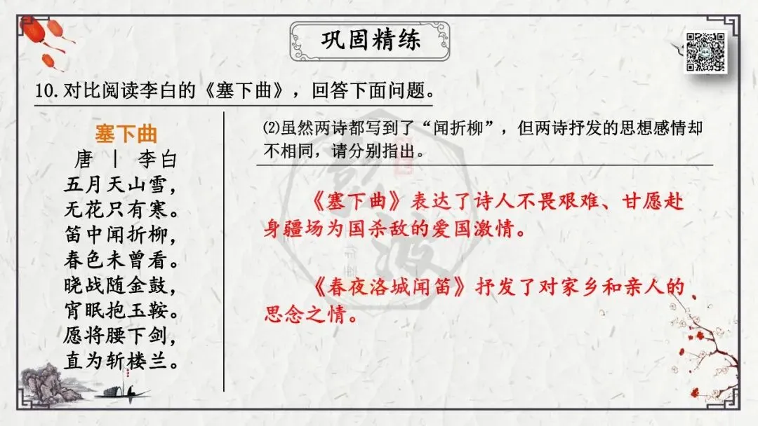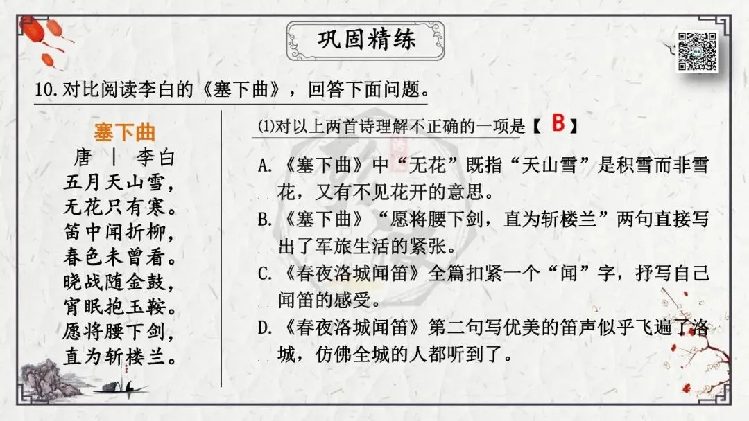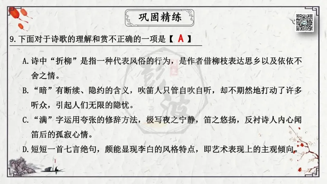 2、理解诗意。这是从思想内容角度考查理解能力,包括诗词字词句的理解,内容的归纳概括,哲理的分析,作品的思想感情倾向等。