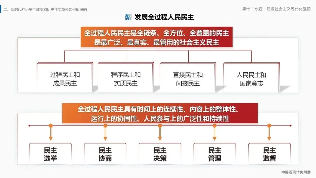党坚持民主集中制,建立健全党对重大工作的领导体制,强化党中央决策议事协调机构职能作用,完善推动党中央重大决策落实机制,严格执行向党中央请示报告制度,强化政治监督,深化政治巡视。【P48】习近平总书记强调,我国全过程人民民主实现了过程民主和成果民主、程序民主和实质民主、直接民主和间接民主、人民民主和国家意志相统一,是全链条、全方位、全覆盖的民主,是最广泛、最真实、最管用的社会主义民主。全过程人民民主具有时间上的连续性、内容上的整体性、运行上的协同性、人民参与上的广泛性和持续性。