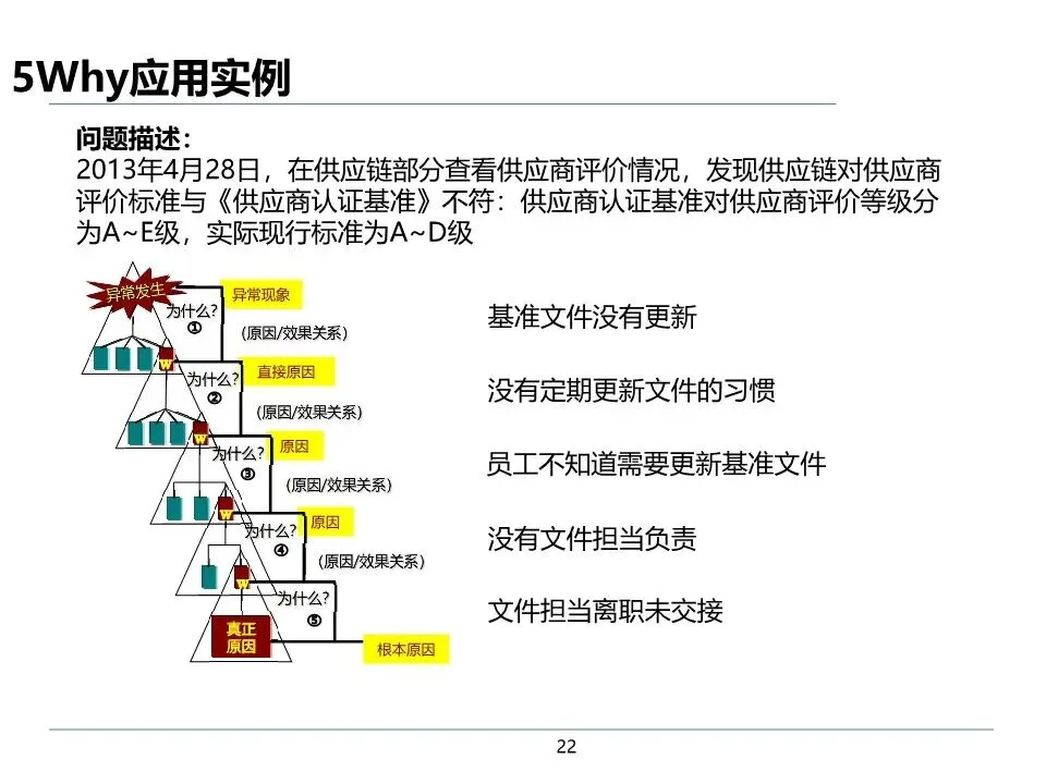 现象:产品表面划痕多Why1:为什么有划痕?→ 搬运时与周转箱摩擦Why2:为什么摩擦?→ 周转箱内壁有毛刺Why3:为什么有毛刺?→ 模具未抛光到位Why4:为什么未抛光?→ 新模具验收未检查内壁Why5:为什么未检查?→ 模具验收标准无内壁粗糙度要求→ 真因:模具验收标准缺失内壁粗糙度要求,导致毛刺流入。
