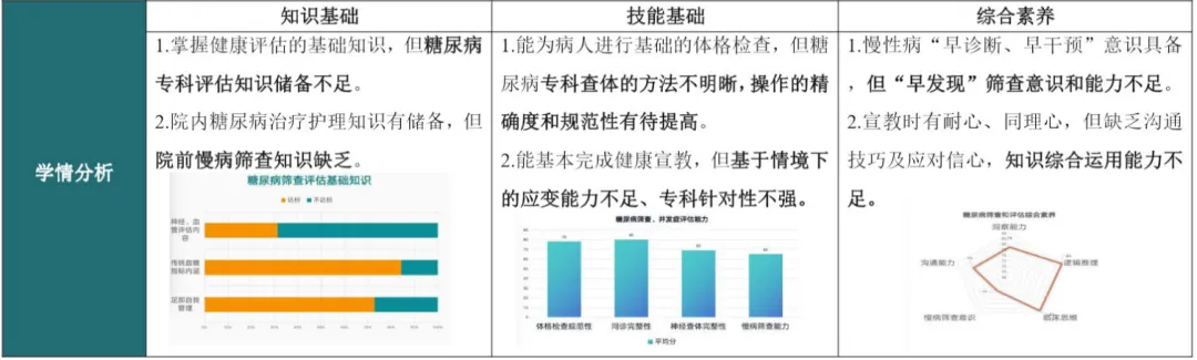 案例将学情分析拆分为“知识基础、技能基础、综合素养”三个具体维度,每个维度都有明确的具体表述,比如“掌握健康评估的基础知识,但糖尿病专科评估知识储备不足”“能为病人进行基础的体格检查,但糖尿病专科查体的方法不明晰”。