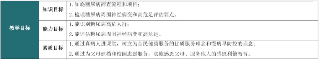 例如,在糖尿病护理相关教案中,教学目标可能只写“掌握糖尿病筛查流程和饮食护理原则”。这种表述仅关注知识目标,没有提到学生是否能运用这些知识识别高危人群、制定个体化护理方案等能力目标,也没有涉及通过护理实践培养优质服务理念、社会责任感等素质目标;即便有些教案加入思政内容,也可能只是单独列出“培养感恩之心”,却没有说明如何通过教学活动实现,导致思政与教学脱节。