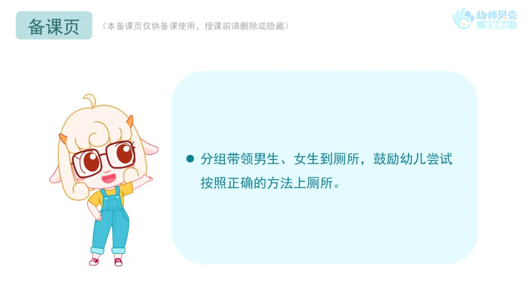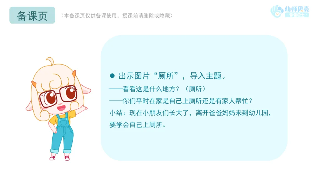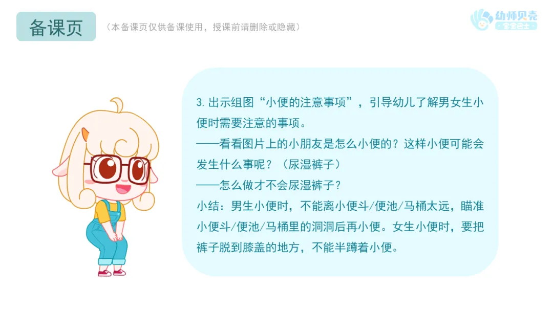l教师可搭配《勇敢告诉老师》活动,让幼儿了解想上厕所或尿裤子等需要帮助的时候,要勇敢向老师寻求帮助。