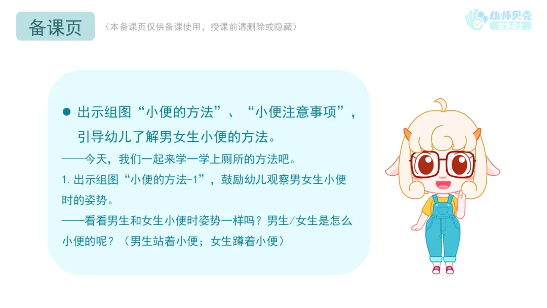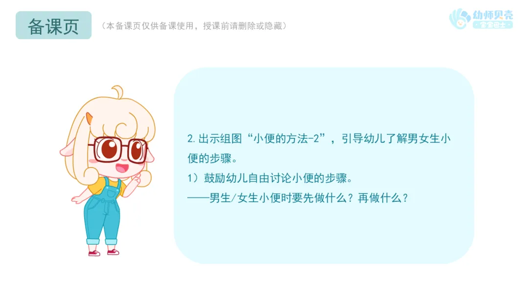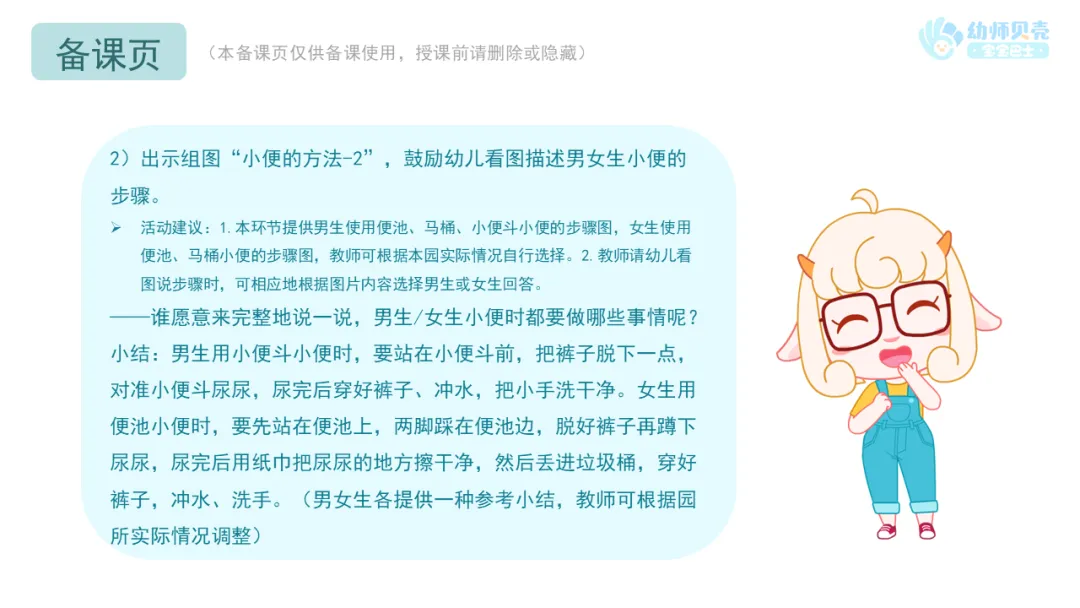 Ø活动建议:1.本环节提供男生使用便池、马桶、小便斗小便的步骤图,女生使用便池、马桶小便的步骤图,教师可根据本