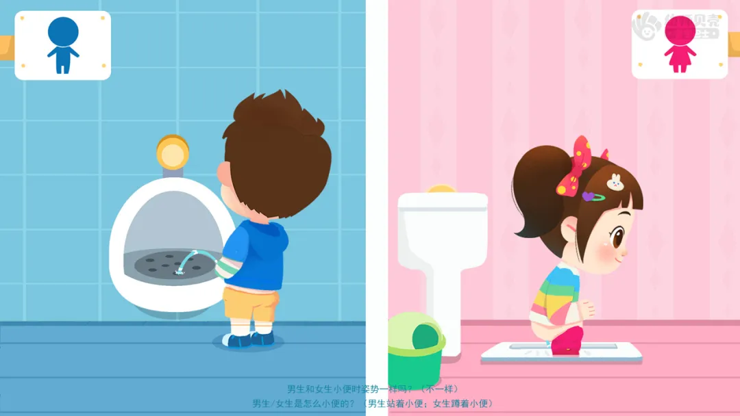 ——看看男生和女生小便时姿势一样吗?男生/女生是怎么小便的呢?(男生站着小便;女生蹲着小便)