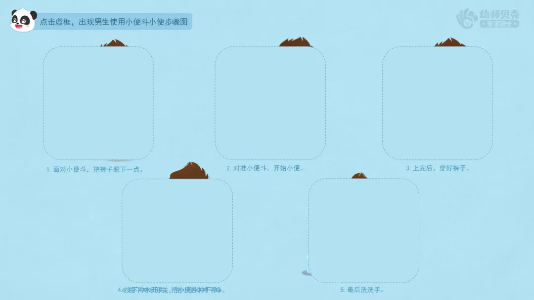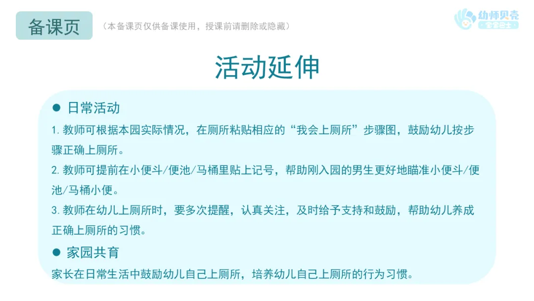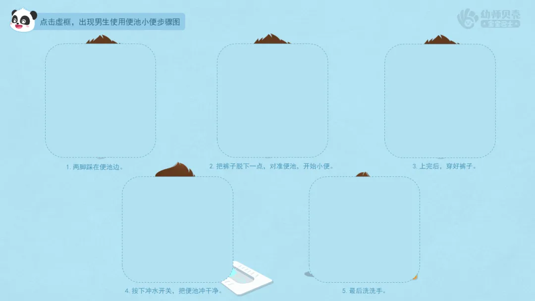 l在本活动开始前,教师可提前在小便斗/便池/马桶里贴上记号,帮助刚入园的男生更好地瞄准小便斗/便池/马桶小便。