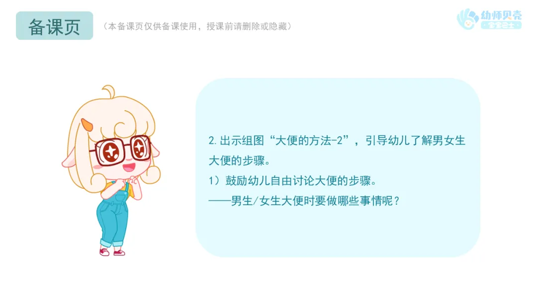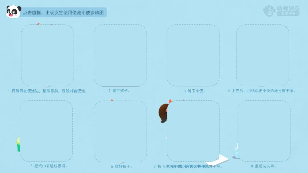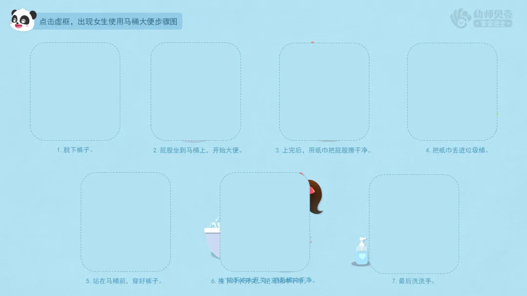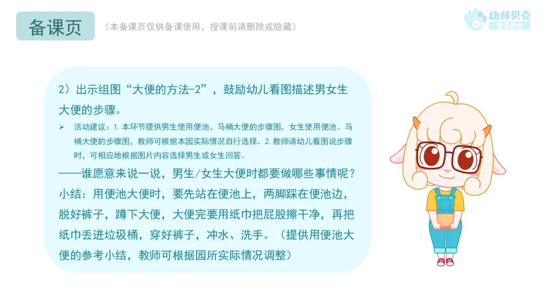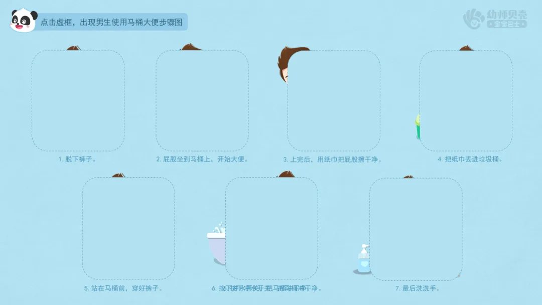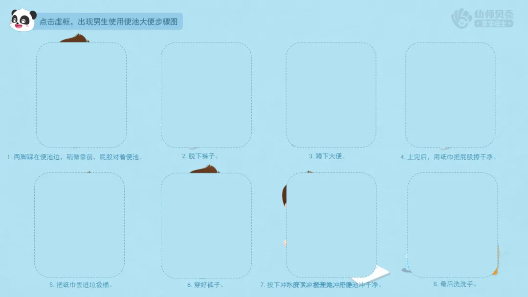 Ø活动建议:1.本环节提供男生使用便池、马桶大便的步骤图,女生使用便池、马桶大便的步骤图,教师可根据本