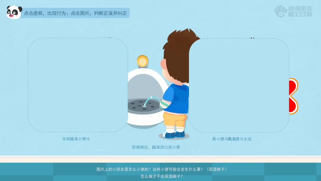小结:男生小便时,不能离小便斗/便池/马桶太远,瞄准便小便斗/便池/马桶里的洞洞后再小便。女生小便时,要把裤子脱到膝盖的地方,不能半蹲着小便。