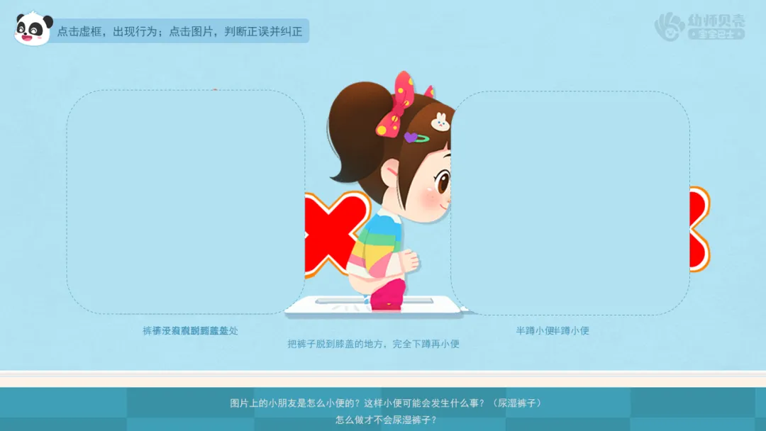 小结:男生用小便斗小便时,要站在小便斗前,把裤子脱下一点,对准小便斗尿尿,尿完后穿好裤子、冲水,把小手洗干净。女生用便池小便时,两脚要先踩在便池边,脱好裤子,蹲下尿尿,尿完后用纸巾把尿尿的地方擦干净,再把纸巾丢在垃圾桶里,穿好裤子,冲水、洗手。(男女生各提供一种参考小结,教师可根据园所实际情况调整)