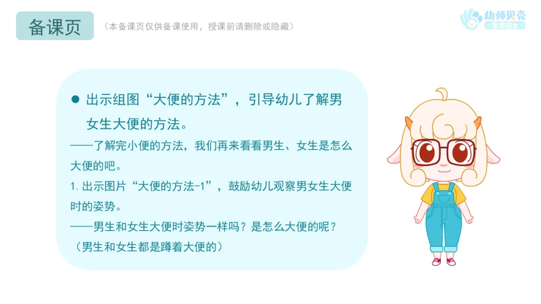 1.出示组图“大便的方法-1”,鼓励幼儿观察男女生大便时的姿势。
