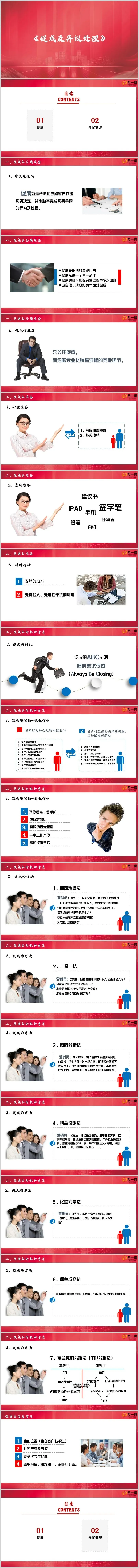 促成的时机:把握促成的时机关键在于捕捉客户的购买信号。购买信号可分为行为上的和语言上的,如客户翻阅资料、对交谈内容感兴趣、主动提出问题等积极信号,以及不停看表、虚应敷衍、有限的目光接触等消极信号。我们要学会细心观察,从客户的言行举止中捕捉购买信号,适时促成。