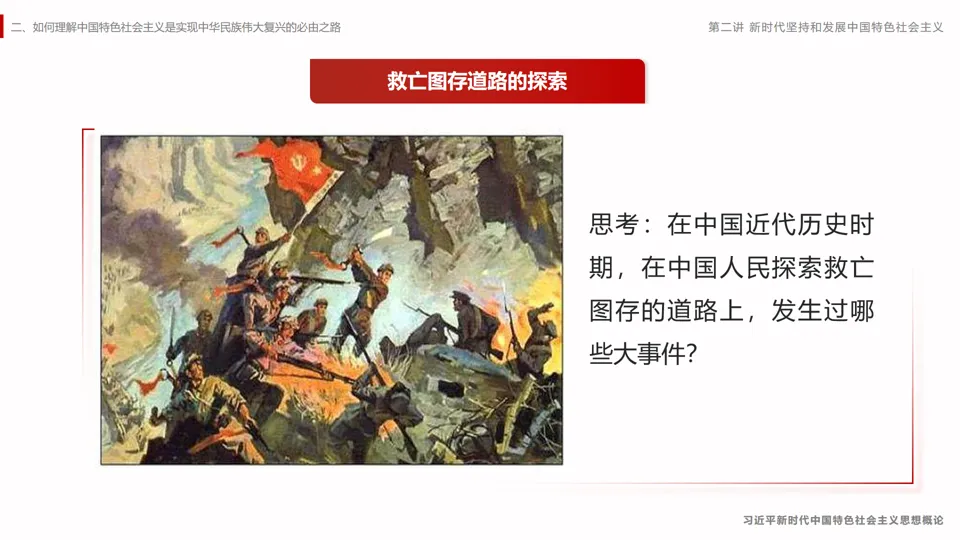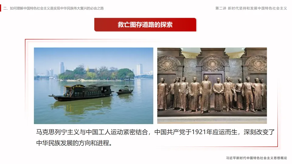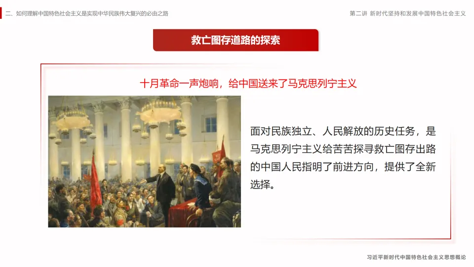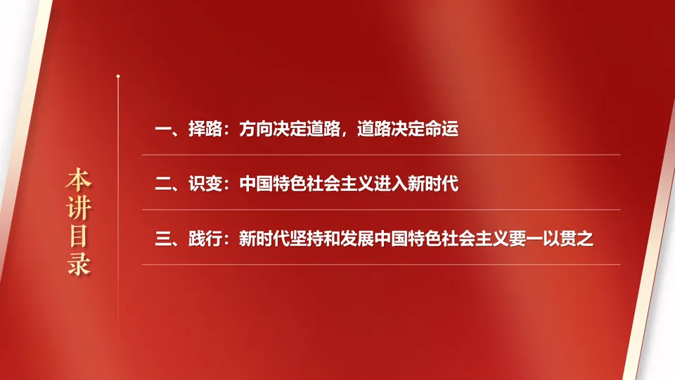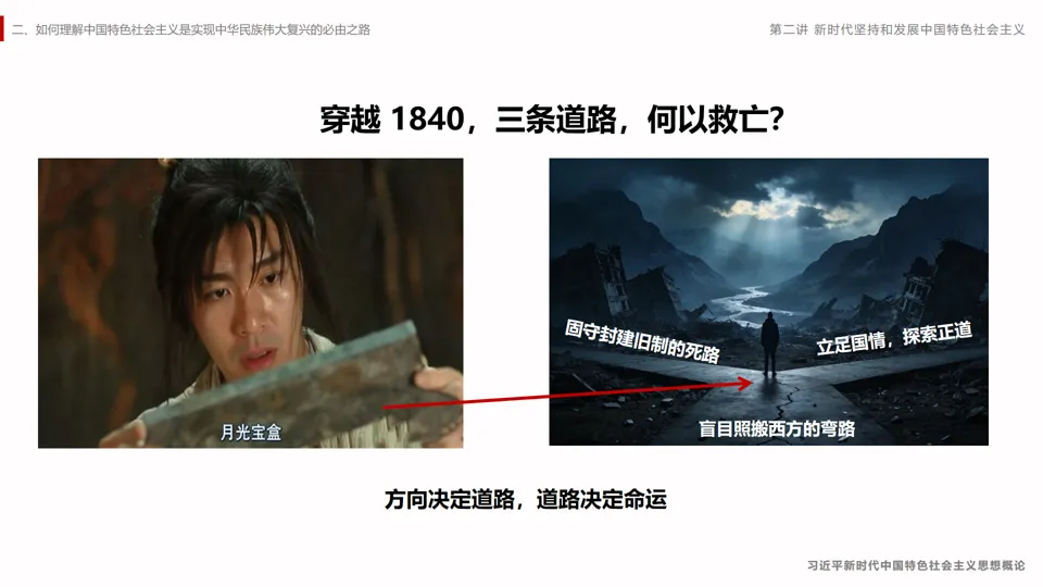 采用国际地位的对比,分析我们坚持中国特色社会主义的必要性,进而引出本章的主题内容。。课程主要分为三个部分,从择路——识变——践行逻辑展开,层层深入。第一节是“方向决定道路,道路决定命运”,这是对中国特色社会主要道路必要性的阐述。第二节是中国特色社会主义进入新时代,这是我国新的历史方位。第三节是新时代坚持和发展中国特色社会主义要一以贯之,这是对我们的要求。