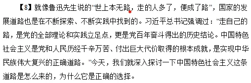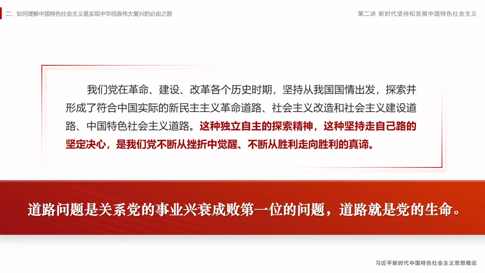 【17】道路问题是关系党的事业兴衰成败第一位的问题,道路就是党的生命。我们党在不同的历史时期,始终坚持从我国国情出发,探索适合中国实际的发展道路。