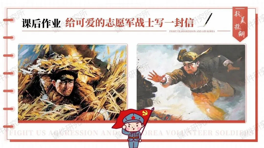 四:课件结尾设置了“给志愿军战士写一封信”的学生活动,升华了主题教育,弘扬了主旋律。