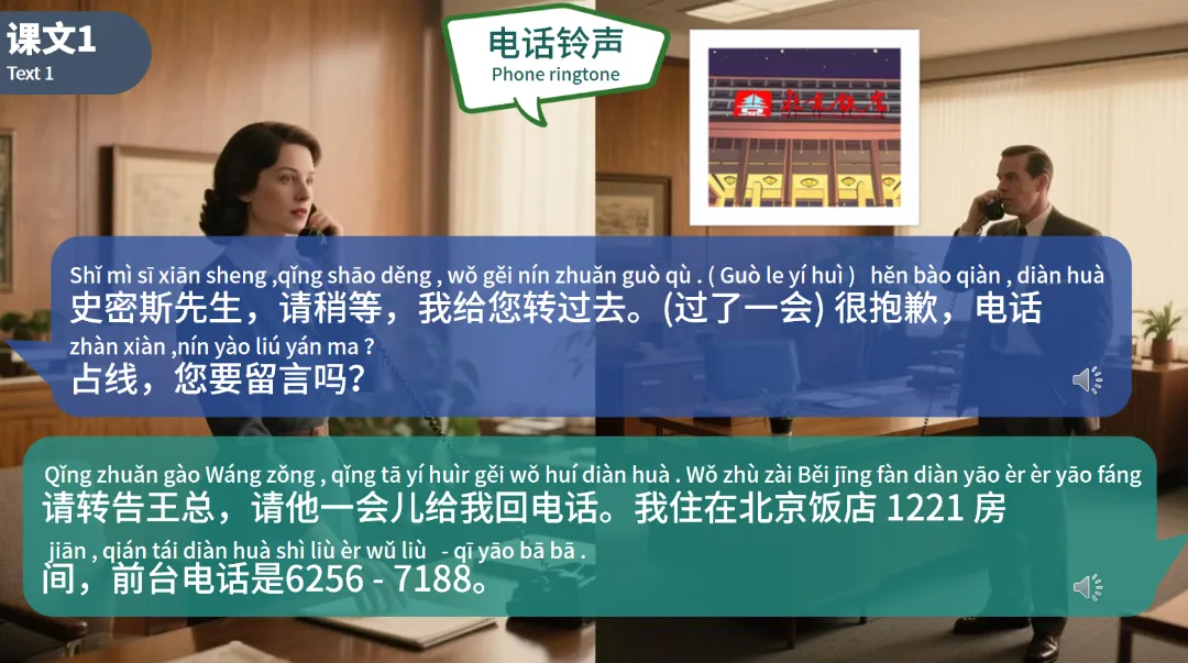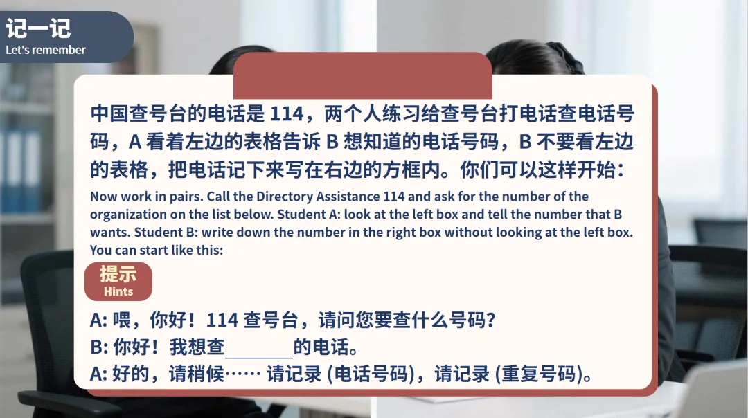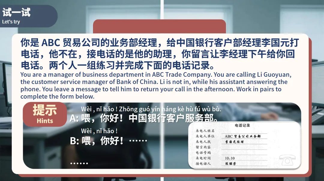 试一试:设定具体的商务情境,如学生作为ABC贸易公司的业务部经理,给中国银行客户部经理李国元打电话,对方不在,接电话的是他的助理,要求学生留言让李经理下午回电话,并完成电话记录。这一练习综合考查了学生对所学知识的掌握和运用能力,为他们在实际商务场景中的应用做好充分准备。