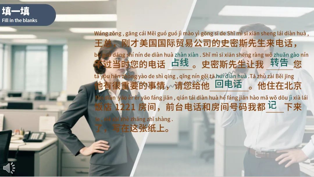 填一填:给出部分语句,让学生根据语境填写合适的词汇,如“王总,刚才美国国际贸易公司的史密斯先生来电话,不过当时您的电话____。史密斯先生让我____您他有很重要的事情,请您给他____。”通过这种方式,强化学生对词汇和语法的记忆与运用能力。