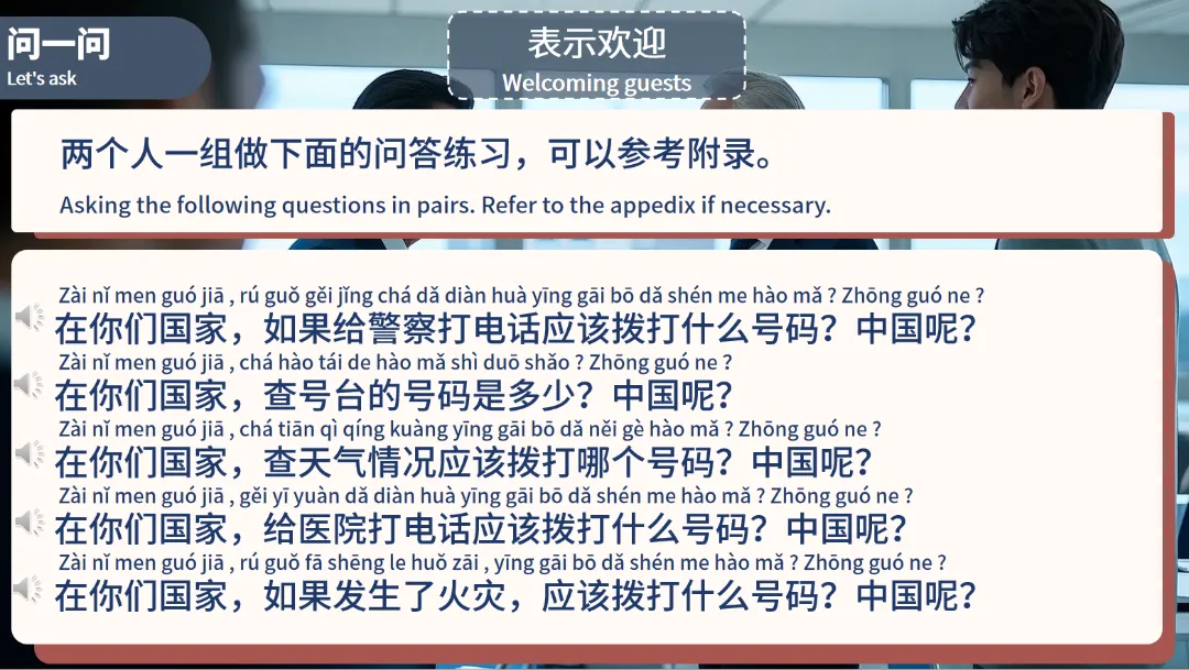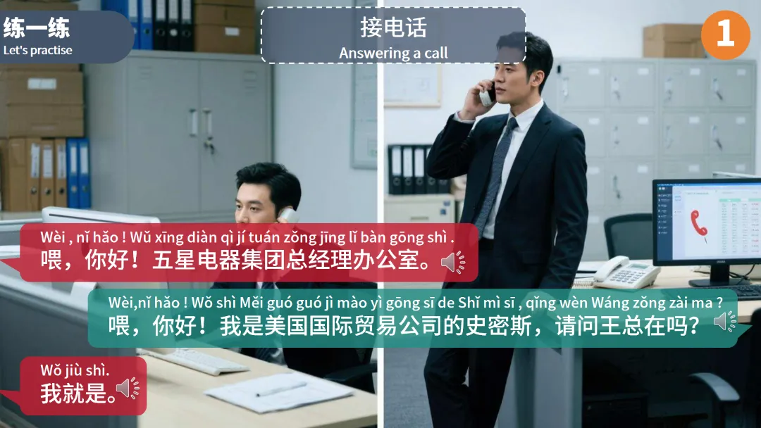 练一练:设置模拟商务电话场景,让学生两人一组进行角色扮演。