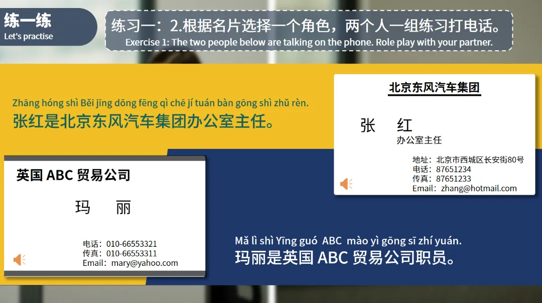 例如,根据提供的名片信息,一方扮演北京东风汽车集团办公室主任张红,另一方扮演英国ABC贸易公司职员玛丽,进行电话交流,练习“请他给我回电话”等相关表达。