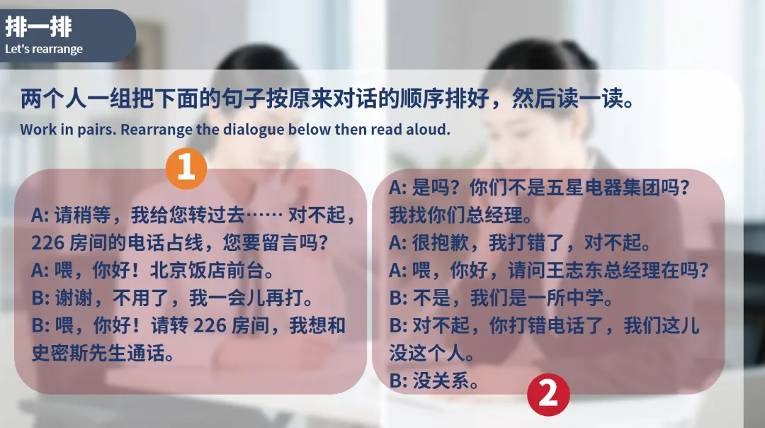 通过这种方式,帮助学生梳理对话的逻辑结构,加深对商务电话交流流程的理解。
