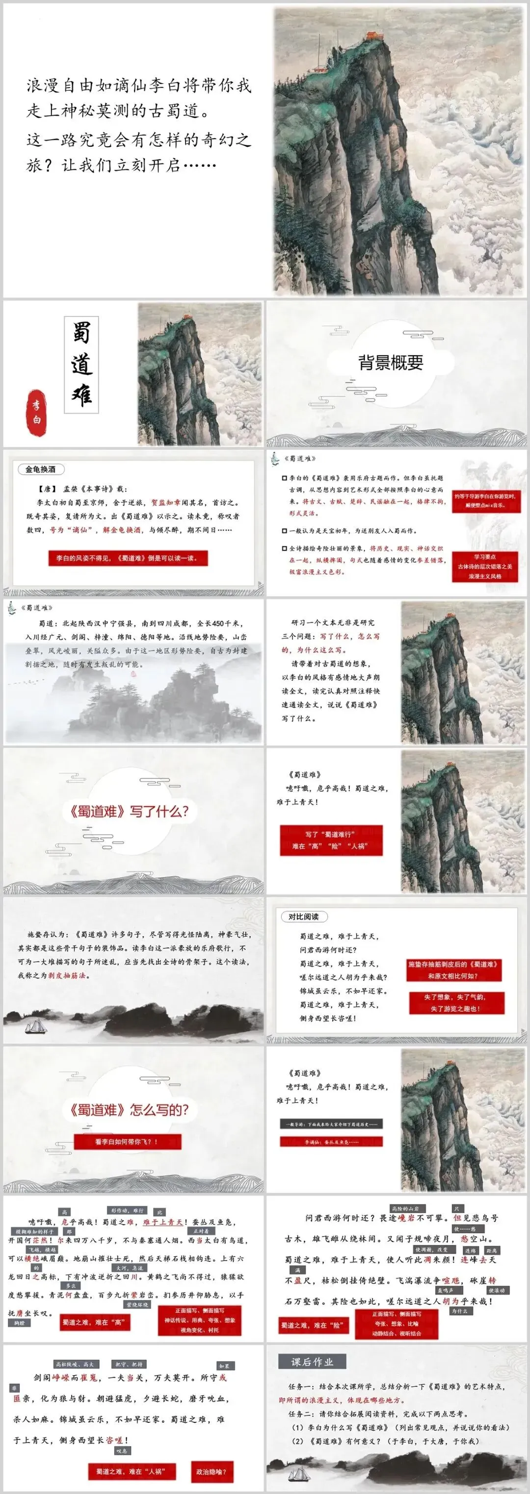 这个《蜀道难》《蜀相》联读课件设计非常有趣!运用学生们熟悉的研学情境,分课时设计,让学生沉浸式去完成学习任务;