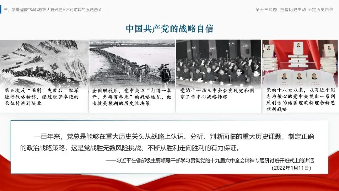 【P42】今天,中国人民更加自信、自立、自强,极大增强了志气、骨气、底气,在历史进程中积累的强大能量充分爆发出来,焕发出前所未有的历史主动精神、历史创造精神,正在信心百倍书写着新时代中国发展的伟大历史。